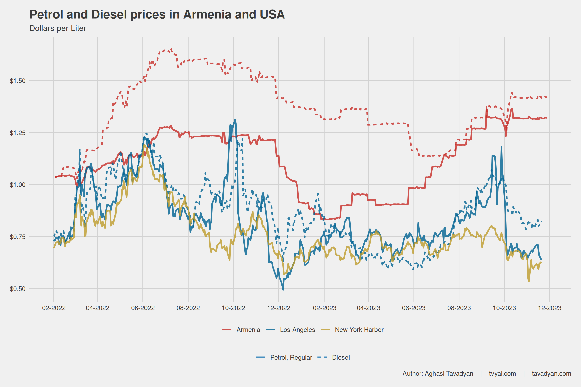 I should note that it is not accurate to directly compare gasoline prices in Armenia and the USA, as the USA is the largest oil-producing and consuming country, which already imports almost no oil from OPEC+ countries. Armenia does not have oil reserves and imports gasoline from Russia. However, global oil prices affect gasoline prices in both the US and Armenian markets, as shown in the chart. Gasoline prices exhibit the same upward and downward trends in almost all countries.