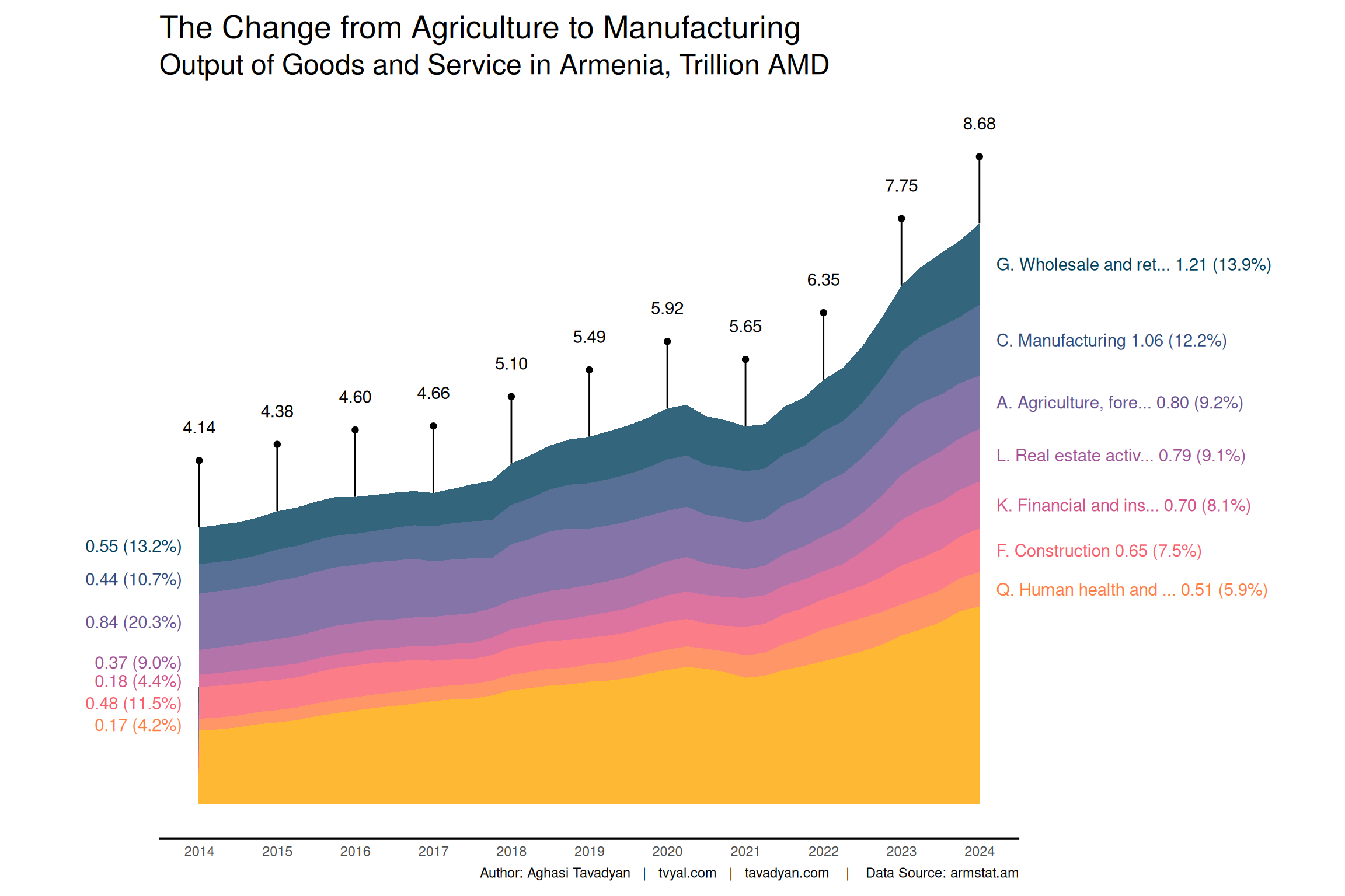 In 2023 the picture is reversed: “Wholesale and retail trade; repair of motor vehicles and motorcycles” is already in first place, providing 13.9 percent of GDP (1,210 billion drams), while agriculture has fallen from a 20.3 percent share to 9.2 percent (800 billion drams) in these 10 years.