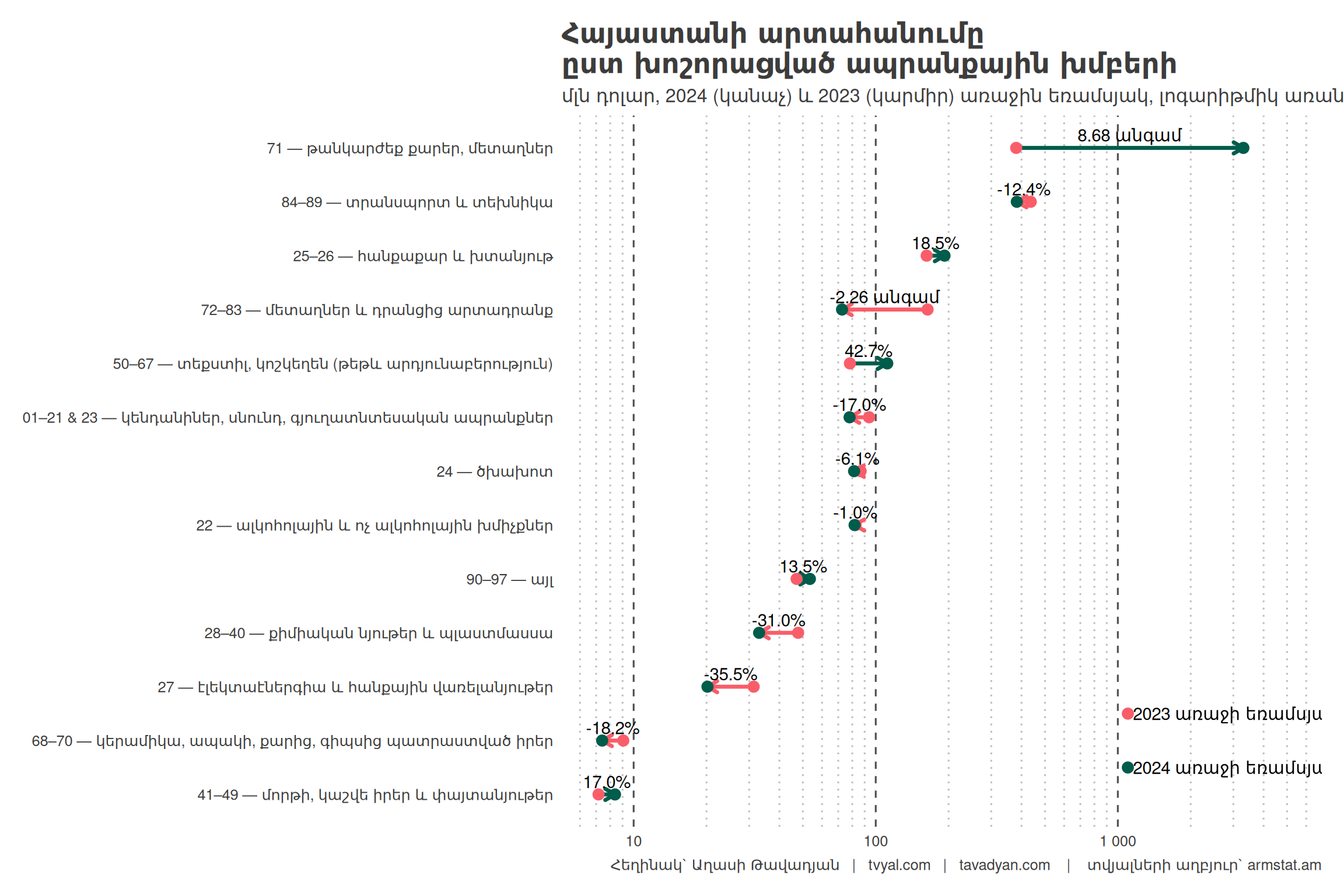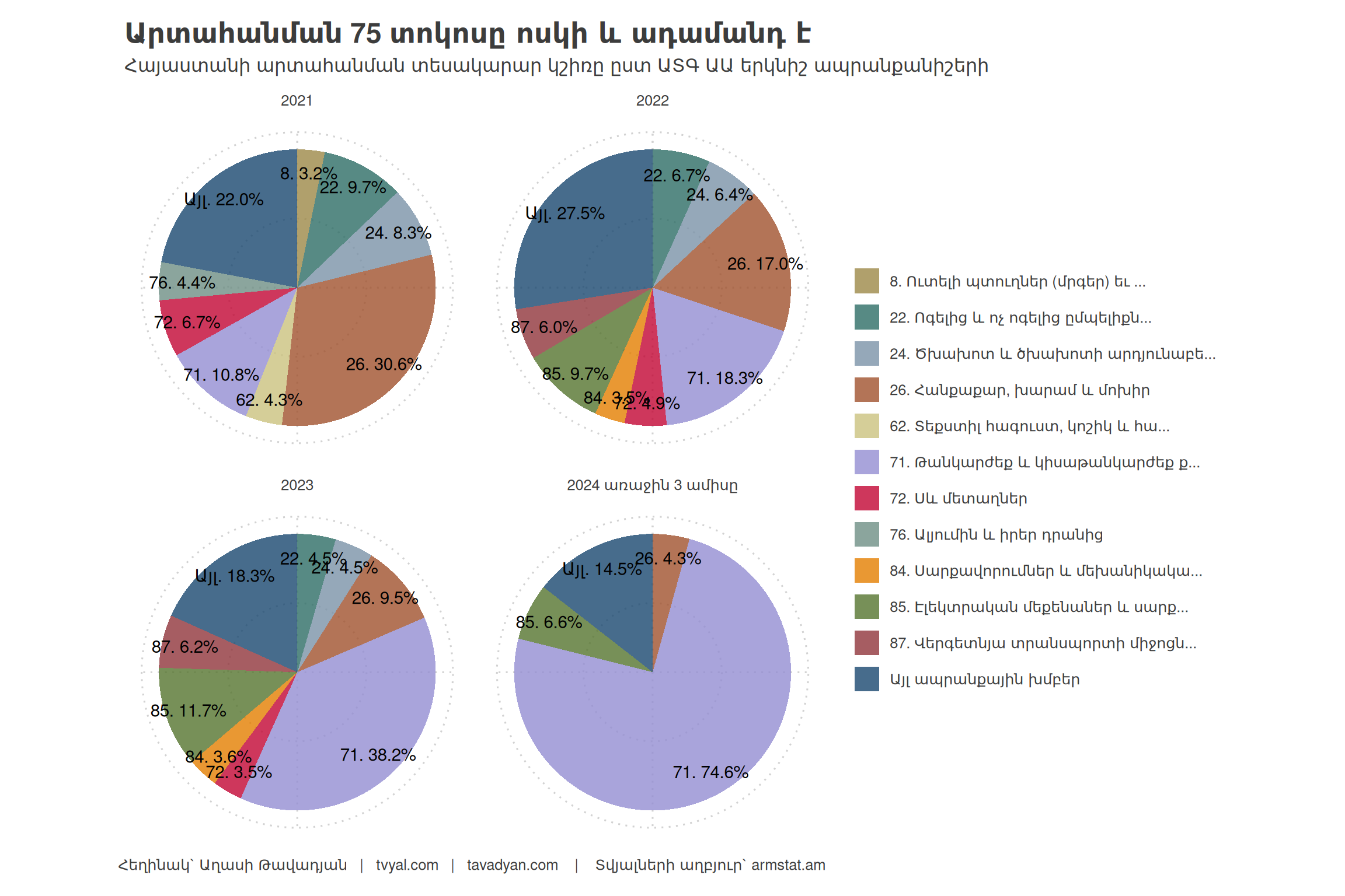 Armenia’s exports in March 2024 compared to the same period of the previous year already amounted to 11.2 billion dollars, of which only 54.7 percent or 6.1 billion dollars is the export of precious and semi-precious stones and metals. Let us note that in March 2023 compared to the same period of 2022, Armenia’s exports amounted to 6.3 billion dollars, of which 1.3 billion dollars or 20.2% was the export of precious and semi-precious stones and metals. The 6.1 billion dollars worth of precious and semi-precious stones and metals were mainly re-exported from Russia to the United Arab Emirates and Hong Kong. The re-export estimated by us for March 2024 on a 12-month basis constitutes about 65% of the 11.2 billion dollars. The re-export methodology is presented via this link.