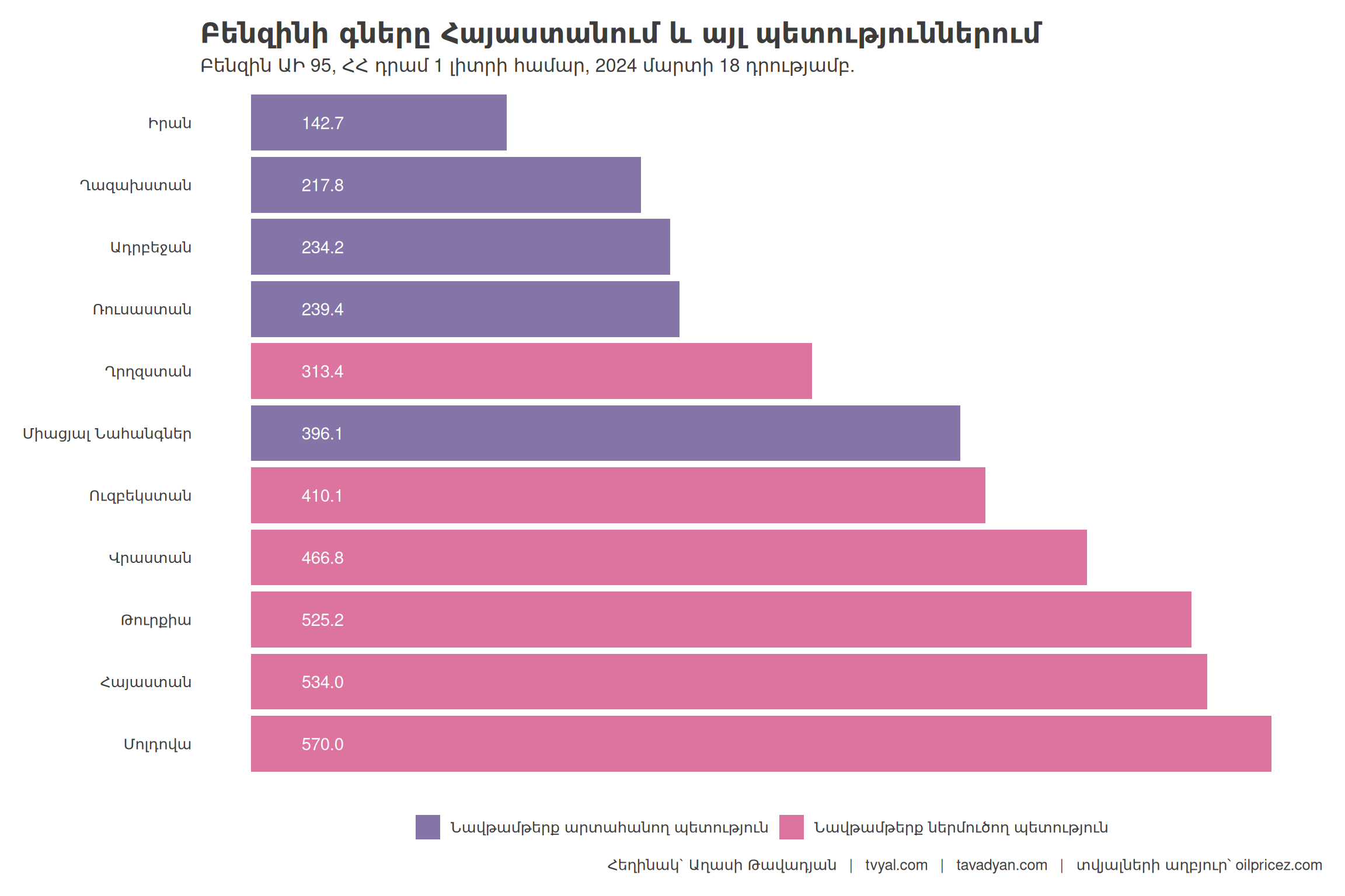 First, let’s look at the price of gasoline in those countries in the region that are generally considered oil-importing countries. I should note that the price of gasoline in Armenia is the highest compared to our neighbors and EAEU countries. However, the reasons for this are mainly transport costs and the fact that Armenia is not an oil-producing state. At this moment, calculated in AMD, the price of AI-95 premium class gasoline in Georgia is about 465 AMD, and in Armenia, 530 AMD. In this material, we will explore what impact gasoline importers actually have on gasoline pricing. Chart 1.