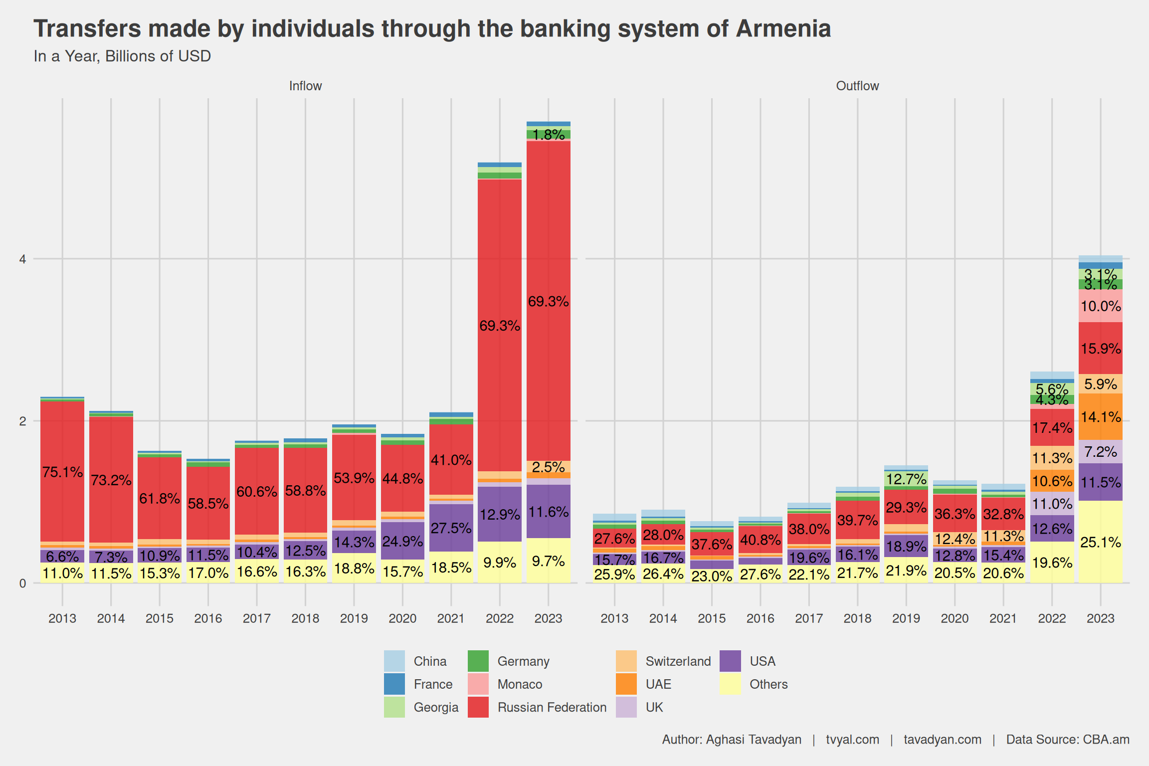 - In 2022, Armenia experienced a substantial increase in international money transfers, particularly from Russia, resulting in an influx of dollars into the country’s banking system. The significant inflow of foreign currency was coupled with a rise in outflows. This dynamic has been instrumental in influencing the exchange rate of the Armenian dram against the US dollar.