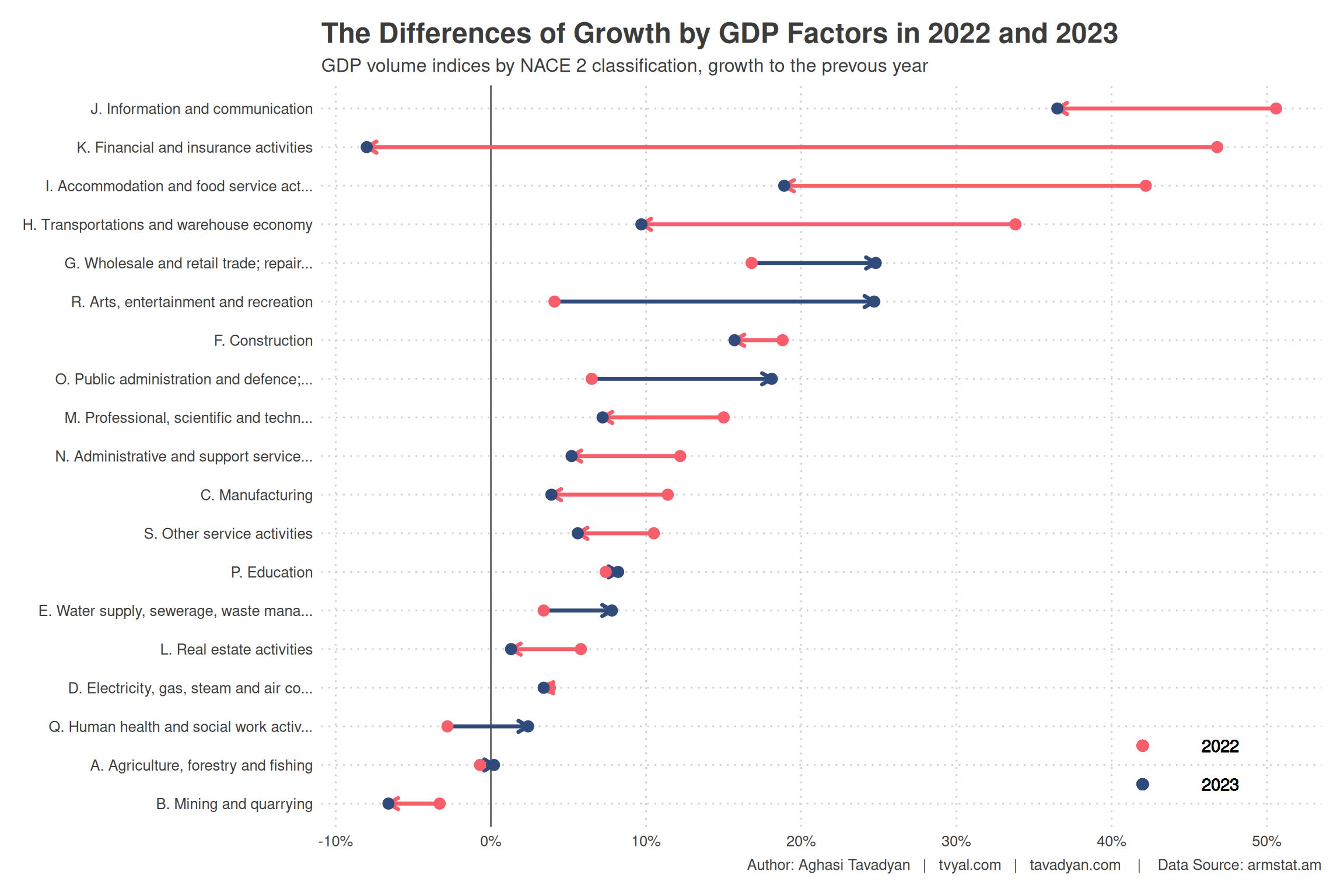 2022-ի համեմատ տնտեսական աճը համեմատաբար ավելի փոքր է եղել, որը և արտացոլում է 3-րդ գծապատկերը, սակայն 2022 թվականին ապահովվել է երկնիշ 12.6 տոկոս տնտեսական աճ, իսկ 2023-ին 8.7 տոկոս, որը նույնպես բավականին զգալի աճի տեմպ է։ 2023 թվականին ՀՆԱ 8.7 տոկոս աճի 0.6 տոկոսային կոտը ապահովել է «Մշակույթ, զվարճություններ և հանգիստի» ոլորտը, որը գրեթե չի նպաստել 2022 թվականի տնտեսական աճին։ Սա նույնպես երևում է 3-րդ գծապատկերում, որտեղ այս ոլոտը, ինչպես նաև մեծածախ և մանրածախ առևտուրը, պետական կառավարումը եղել են հիմնական ճյուղերը, որոնք ապահովվել են մեծ շատ աճ, քան 2022 թվականին։