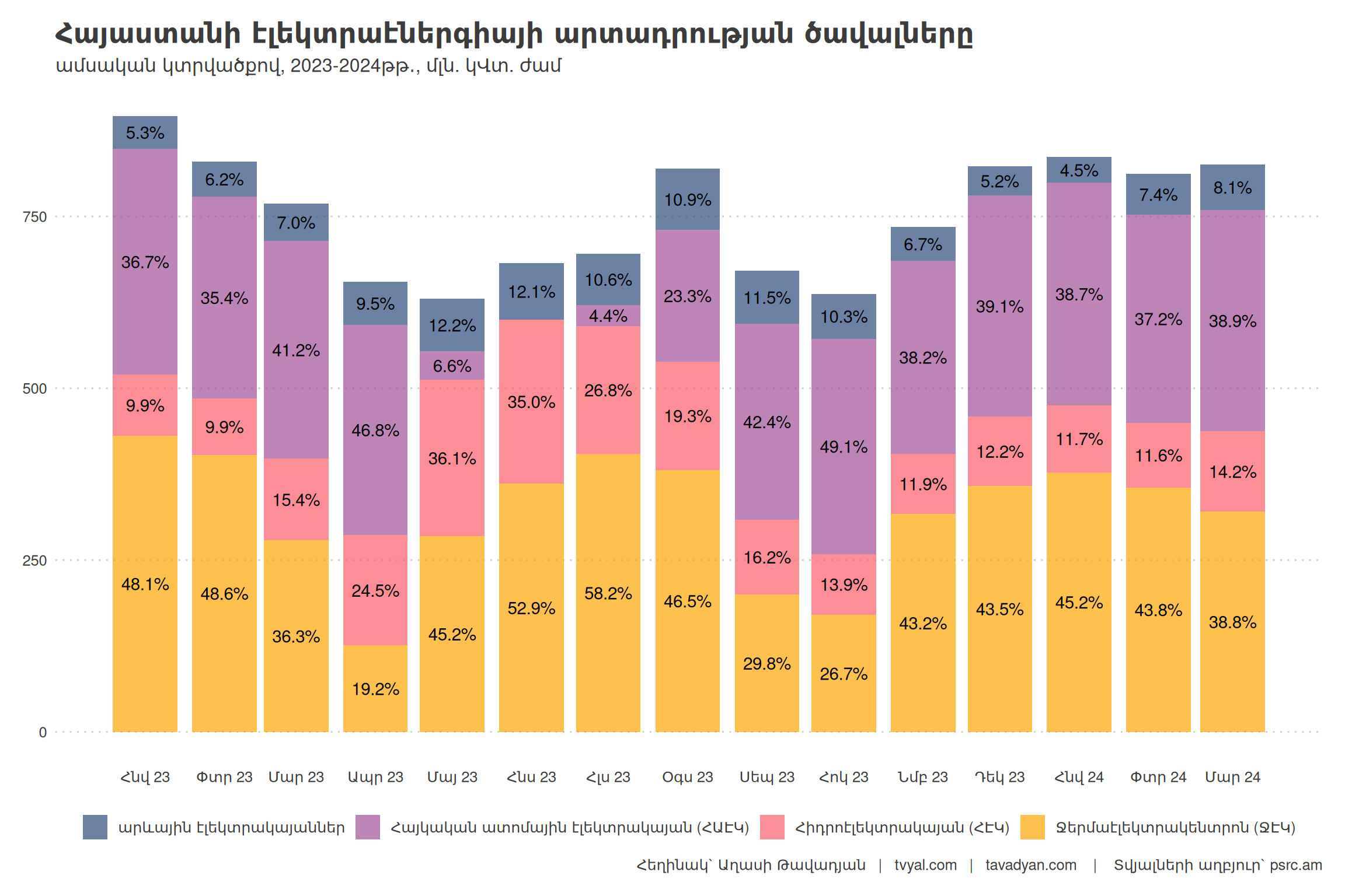Առաջին գծապատկերում պատկերված է Հայաստանում էլեկտրաէներգիայի ամսական արտադրությունը` ըստ կայանների տեսակների, 2023 թվականի և 2024 թվականի առաջին եռամսյակի համար: Գծապատկերում երևում է էլեկտրականության արտադրության տարբեր աղբյուրների սեզոնայնությունը։