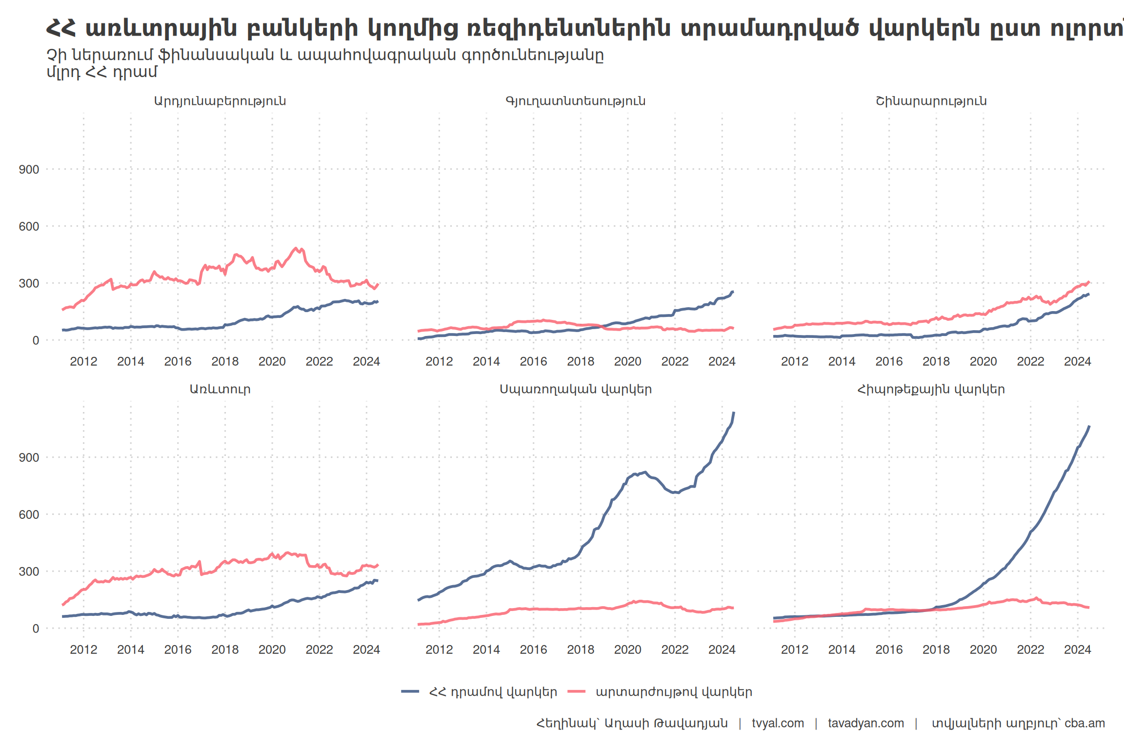 Առևտրի ոլորտին արտարժույթով տրամադրվող վարկերը նույնպես ունեն անկման միտում, սակայն սա կոմպենսացվում է դրամով տրամադրվող վարկերով, որը դրական է։ Գյուղատնտեսության վարակավորումը, ինչպես առևտրի ոլորտը, նույնպես ունի որոշակի դրական միտում, այստեղ արտարժույթով վարկերը նվազել են, իսկ ՀՀ դրամով վարկավորումը բավականին աճ է արձանագրել։ Գյուղատնտեսության ոլորտին դրամով տրամադրված վարկերը 2022 թվականից գրեթե կրկնապատկվել են։ Շինարարության վարկավորումը և՛ դրամով, և՛ արտարժույթով աճում է, որը նույնպես ցույց է տալիս որոշակի դրական միտում։ 2020 թվականից այս ոլորտին դրամով տրամադրված վարկերը աճել են ավելի քան 3 անգամ, իսկ արտարժույթով՝ 1.5 անգամ։