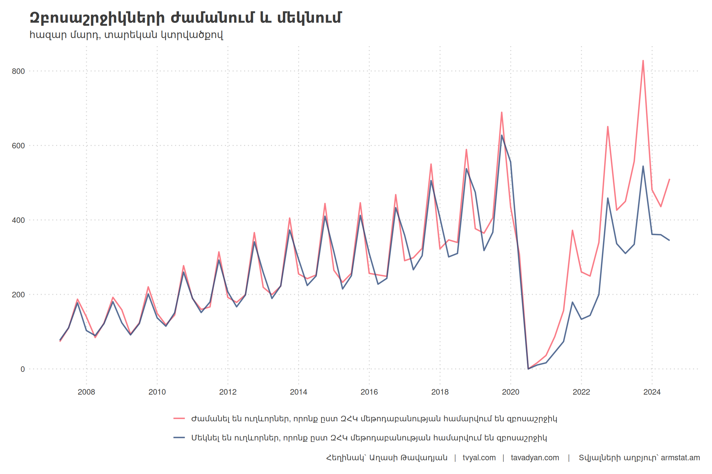 զբոսաշրջիկների ժամանումների և մեկնումների դինամիկան տարեկան կտրվածքով: Մինչև 2021թ. ժամանող և մեկնող զբոսաշրջիկների թիվը գրեթե հավասար էր: Նույնքան զբոսաշրջիկ էր գալիս Հայաստան, որքան մեկնում էր: Առկա էր զբոսաշրջիկների հոսքի տարեկան միջինը 12 տոկոս կայուն աճ: Առկա է նաև զբոսաշրջիկների որոշակի սեզոնայնություն ամռան ամիսներին մոտ 2 անգամ