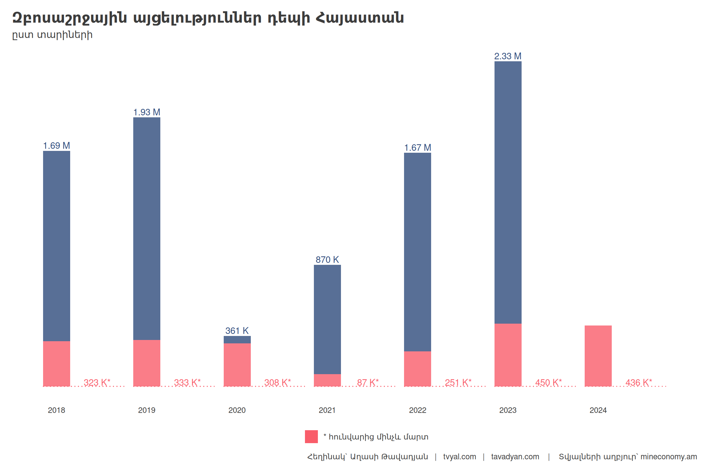 Նշենք, որ մինչև 2019թ. մեկնող և ժամանող զբոսաշրջիկների թիվը գրեթե հավասար էր և ուներ կայուն աճի միտում: 2020թ. համաճարակով պայմանավորված՝ զբոսաշրջիկների թիվը զգալիորեն կրճատվեց: 2021-2023 թվականներին գրանցվել է արագ տեմպերով վերականգնողական աճ: Հատկանշական է, որ ի տարբերություն մինչև 2019թ. գրանցված ցուցանիշների, երբ մեկնողների և ժամանողների թիվը գրեթե հավասար էր, այս ժամանակահատվածում՝ ըստ պաշտոնական տվյալների, 1.5 անգամ ավելի շատ զբոսաշրջիկ է ժամանել Հայաստան, քան մեկնել: Բացարձակ տարբերությունը այս 3 տարիների ընթացքում կազմել է 1.65 մլն մարդ: Այսպիսով՝ 2021-23 թվականների ընթացքում Հայաստան է ժամանել 4.86 մլն զբոսաշրջիկ, իսկ մեկնել է 3.22 մլն զբոսաշրջիկ:
