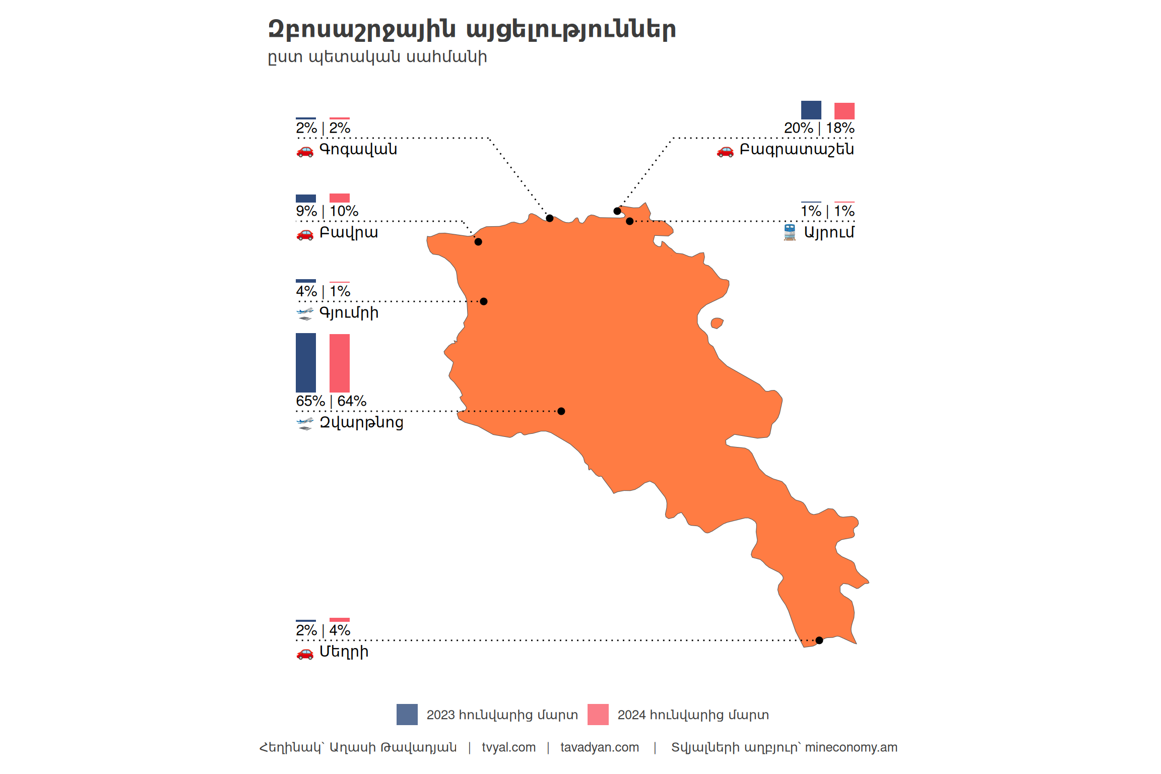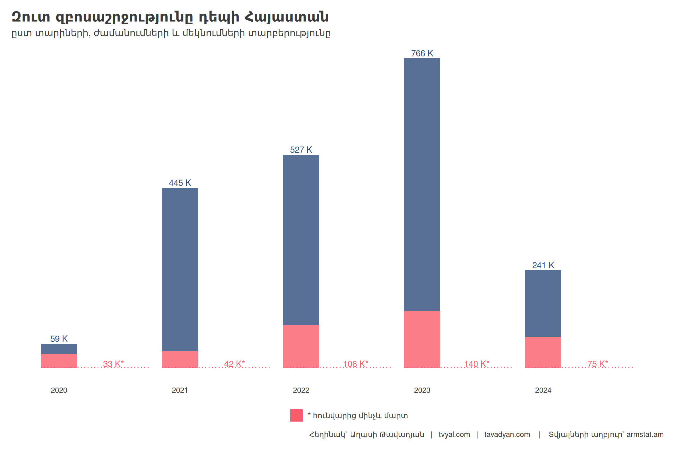 Նշենք, որ 2023 թվականի առաջին եռամսյակում Հայաստան է այցելել 450 հազար մարդ, որից 50 տոկոսը կամ 225 հազարը եղել են Ռուսաստանի Դաշնությունից: 2024 թվականի առաջին եռամսյակում Հայաստան է այցելել 436 հազար մարդ, որից 42 տոկոսը կամ 184 հազարը եղել են Ռուսաստանից: Փաստորեն, 2020 թվականից հետո առաջին անգամ առկա է Հայաստան ժամանած զբոսաշրջիկների թվի կրճատում: 2024 թվականի առաջին եռամսյակում 3.2 տոկոսով ավելի քիչ զբոսաշրջիկ է այցելել Հայաստան, քան 2023 թվականի նույն ժամանակահատվածում, իսկ Ռուսաստանից եկած զբոսաշրջիկների թիվը նվազել է 18.7 տոկոսով: Նկատվում է նաև Ռուսաստանից եկած զբոսաշրջիկների տեսակարար կշռի կրճատում:**