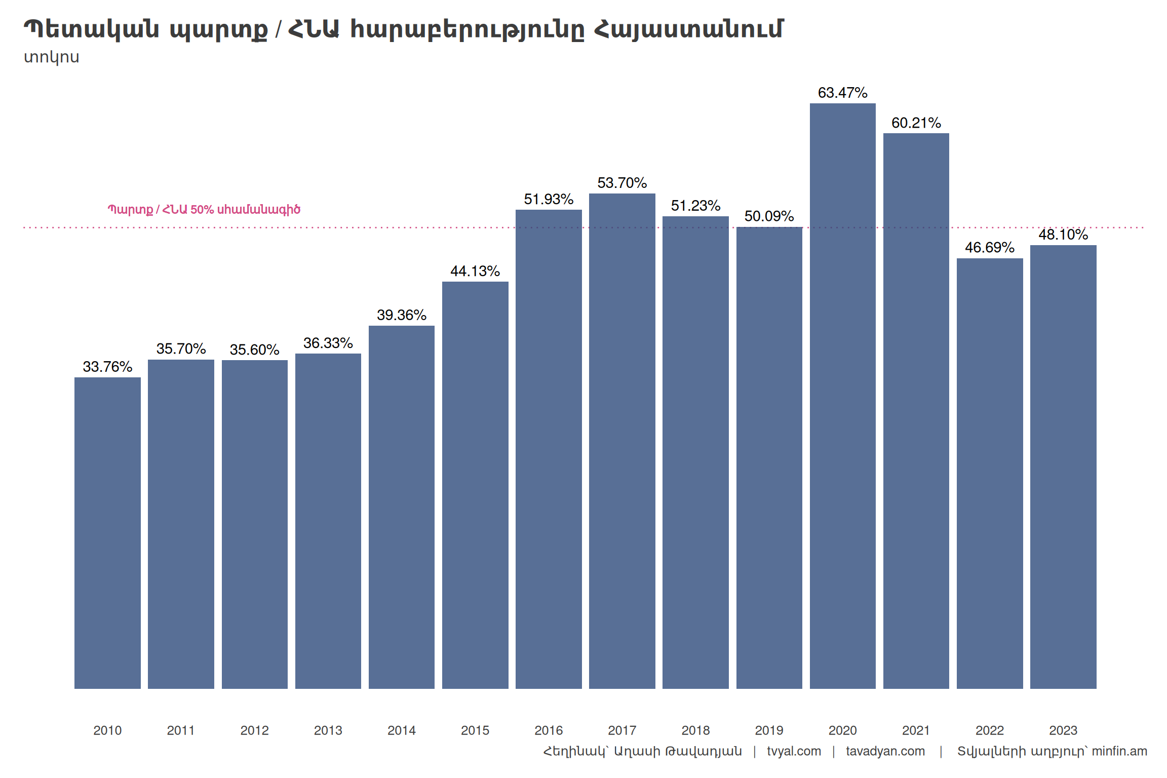 Ինչպես երևում է 4-րդ գծապատկերում, պետական պարտք/ՀՆԱ հարաբերությունը առաջին անգամ հատել է 50 տոկոսի սահմանագիծը 2016 թվականին՝ կազմելով 51.9 տոկոս։ Սա հիմնականում պայմանավորված էր Ռուսաստանում արժութային ճգնաժամով, որի արդյունքում արժեզրկվեցին տարածաշրջանի բոլոր արժույթները, ինչպես նաև դրամը, որը կտրուկ մեծացրեց արտաքին պետական պարտքի սպասարկումը։ Տարեկան կտրվածքով պետական պարտք / ՀՆԱ հարաբերությունը առավելագույնի է հասել 2020 թվականին, երբ այն հատել է 63.5 տոկոսի սահմանագիծը, իսկ եռամսյակային կտրվածքով՝ 2021թ․ առաջին եռամսյակում՝ 69.8 տոկոս։ Նշենք, որ 2020 թվականին ՀՆԱ աճը բացասական էր՝ կազմելով -7.2 տոկոս, ինչը հիմնականում պայմանավորված էր հակահամաճարակային միջոցառումներով և 44-օրյա պատերազմով, որոնք նաև նպաստեցին պետական պարտքի աճին։ 2022 թվականին պետական պարտք/ՀՆԱ հարաբերությունը հիմնականում կարողացավ իջնել ի հաշիվ դրամի արժևորման, որը պայմանավորված էր նրանով, որ 2022 թվականին Ռուսաստանի դեմ պատժամիջոցներով դրդված՝ բավականին մեծ քանակությամբ արտարժութային միջոցներ մտան Հայաստան, ինչը արժևորեց դրամը, և, որպես հետևանք, իջեցրեց պետական պարտքի սպասարկումը։ Այս իրավիճակը ցույց է տալիս, որ արտաքին գործոնները կարող են էական ազդեցություն ունենալ Հայաստանի տնտեսության և պետական պարտքի դինամիկայի վրա: Սակայն պետք է նշել, որ նման իրավիճակները չեն կարող դիտարկվել որպես կայուն միտում, և երկարաժամկետ հեռանկարում անհրաժեշտ է ուշադրություն դարձնել պետական պարտքի կառավարման ավելի կայուն մեխանիզմների մշակմանը:
