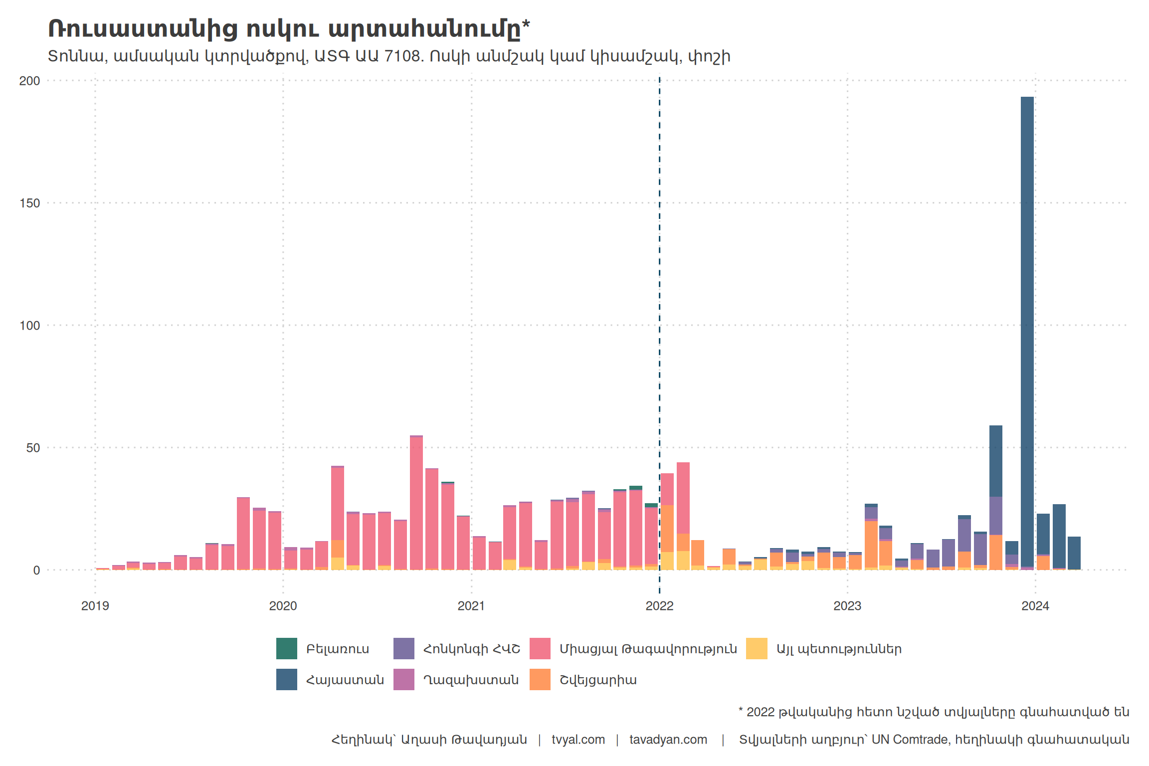 Այնուամենայնիվ, 2022 թվականին իրավիճակը կտրուկ փոխվեց: Ռուսաստանի դեմ կիրառված պատժամիջոցները հանգեցրին ոսկու արտահանման ուղղությունների արագ դիվերսիֆիկացման: Միացյալ Թագավորություն արտահանման կտրուկ անկում է գրանցվել՝ զուգորդված նոր նշանակալի գործընկերների, այդ թվում՝ Հայաստանի ի հայտ գալով: