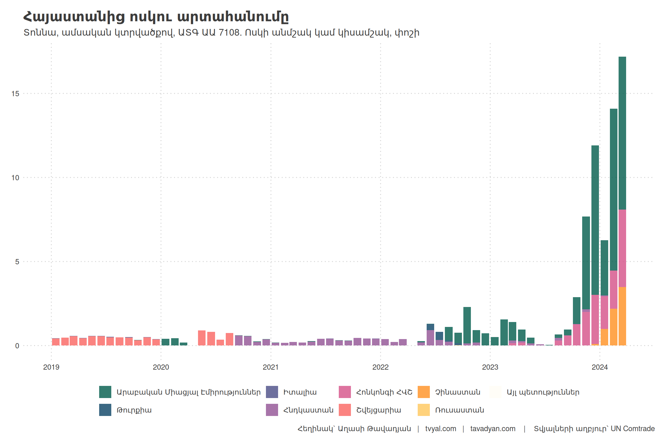 Փոփոխությունը ակնհայտ է։ Եթե 2019 թվականին Շվեյցարիան Հայաստանի ոսկու արտահանման հիմնական ուղղությունն էր (արտահանման 96,6%-ը), ապա 2023 թվականին Արաբական Միացյալ Էմիրություններն են դարձել գերակշռող ստացողը (71,5%), որին հաջորդում է Հոնկոնգը (25,4%):