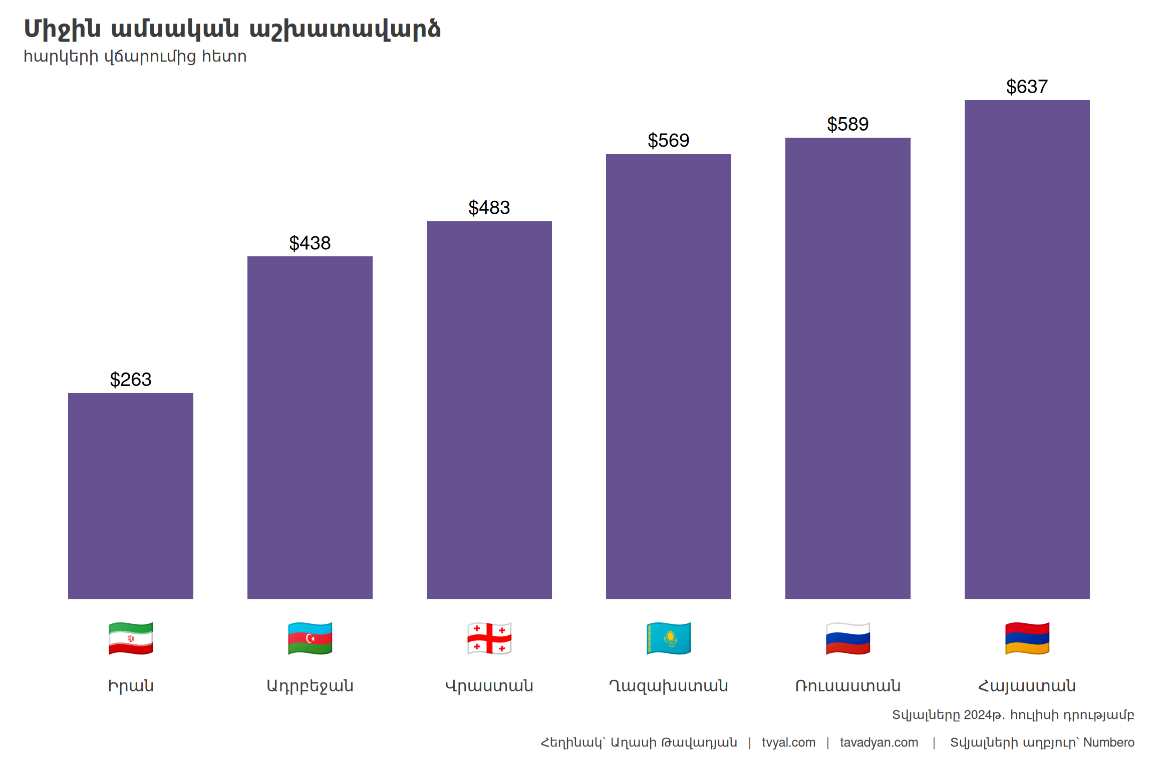 2024 թվականի հուլիսի դրությամբ վերջին տվյալների համաձայն՝ Հայաստանը տարածաշրջանում առաջատար է միջին ամսական աշխատավարձերի առումով (հարկերից հետո)՝ գերազանցելով նույնիսկ Ռուսաստանին 8.1%-ով: Հայաստանում միջին ամսական աշխատավարձը կազմում է 637 դոլար՝ Ռուսաստանի 589 դոլարի համեմատ: Այնուամենայնիվ, այս համեմատությունը չպետք է դիտարկել կոնտեքստից դուրս: Հայաստանի բնակչության 47%-ը բնակվում է Երևանի մետրոպոլիայի տարածքում, մինչդեռ Ռուսաստանի բնակչության միայն 18%-ն է ապրում Մոսկվայի մետրոպոլիայի տարածքում: Ավելին, մեր վերջին վերլուծությունը ցույց է տալիս, որ Հայաստանում մասնավոր հատվածի աշխատատեղերի 76%-ը կենտրոնացված է Երևանում, ինչը ընդգծում է քաղաքային և գյուղական տարածքների միջև զգալի անհավասարությունը: Երևանում աշխատատեղերի կենտրոնացումը շարունակում է ուժեղանալ: 2022 թվականին ոչ պետական աշխատատեղերի 76.3%-ը գտնվում էր մայրաքաղաքում՝ նշանակալի աճ գրանցելով նախորդ տարիների համեմատ: Երևանի մասնավոր հատվածը արձանագրել է 19.5% աճ՝ մարզերի համեստ 4.7%-ի համեմատ: Ընթացիկ գնահատականները ենթադրում են, որ այս կենտրոնացումը կարող է բերել նրան, որ Երևանի մասնաբաժինը մասնավոր հատվածի աշխատատեղերի քանակում հասնի 80%-ի: