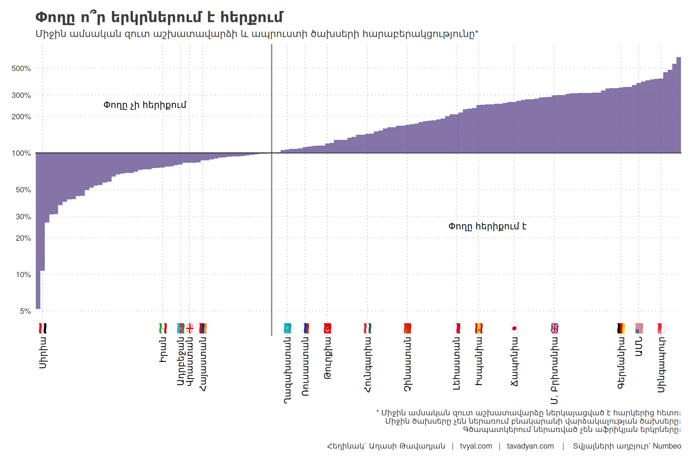 Այս շաբաթվա տնտեսական վերլուծությունն առնչվում է Հայաստանի տնտեսության տարբեր ասպեկտներին՝ համեմատություններ անցկացնելով հարևան երկրների և գլոբալ տնտեսական հսկաների հետ: Մեր վերլուծությունը հիմնված է Numbeo-ի տվյալների վրա, որը սպառողական գների և կյանքի որակի այլ ցուցանիշների գլոբալ շտեմարան է: