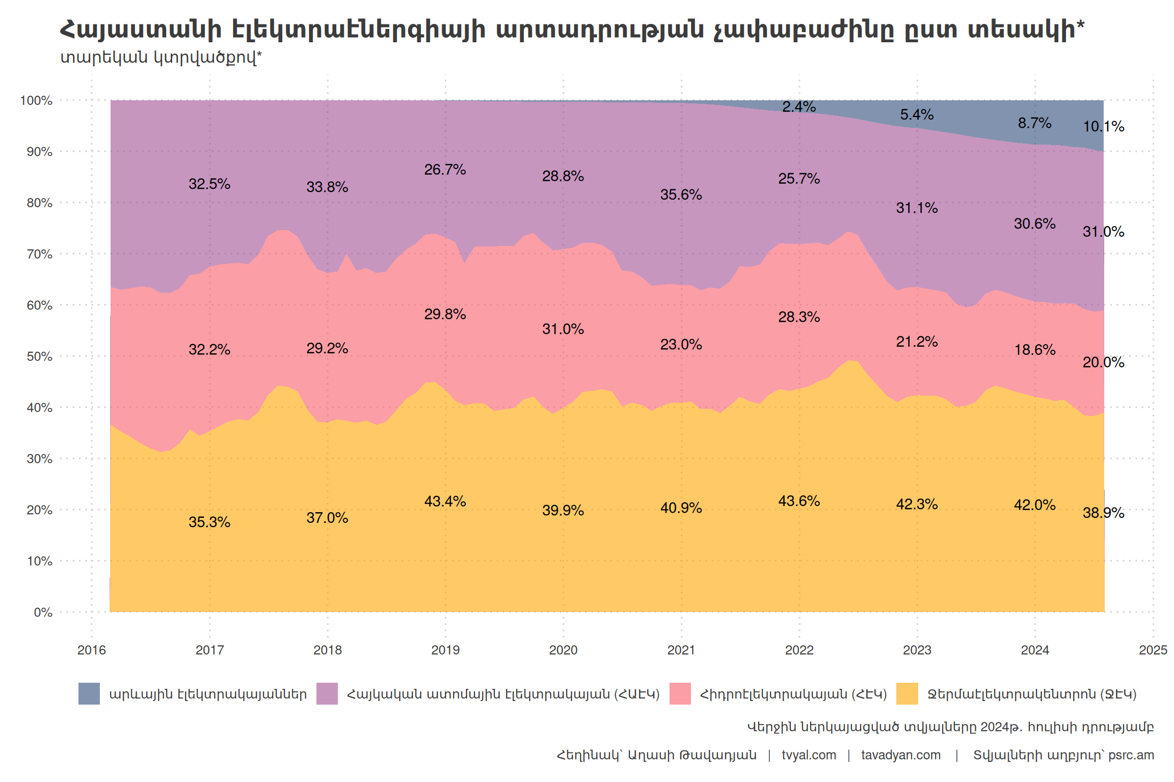 Երկրորդ գծապատկերում երևում է էլեկտրականության արտադրությունն ըստ հիմնական աղբյուրների։ Այս գծապատկերը արտացոլում է էլեկտրականության տարեկան արտադրությունը՝ ըստ էլեկտրակայանների տեսակների: Գծապատկերի ստորին հատվածում տրված են յուրաքանչյուր տարվա արտարդրության տոկոսային կշիռները: Այսպես, 2015-ին էլ. արտադրության 35 տոկոսը ապահովել է ՋԷԿ-ը, 32-ը՝ ՀԱԷԿ-ը և 28-ը՝ ՀԷԿ-ը: 2024-ի հուլիսի դրությամբ արդեն համապատասխանաբար՝ 39, 31, 20, իսկ արևային էլեկտրակայանները՝ արդեն 10.1 տոկոսը: