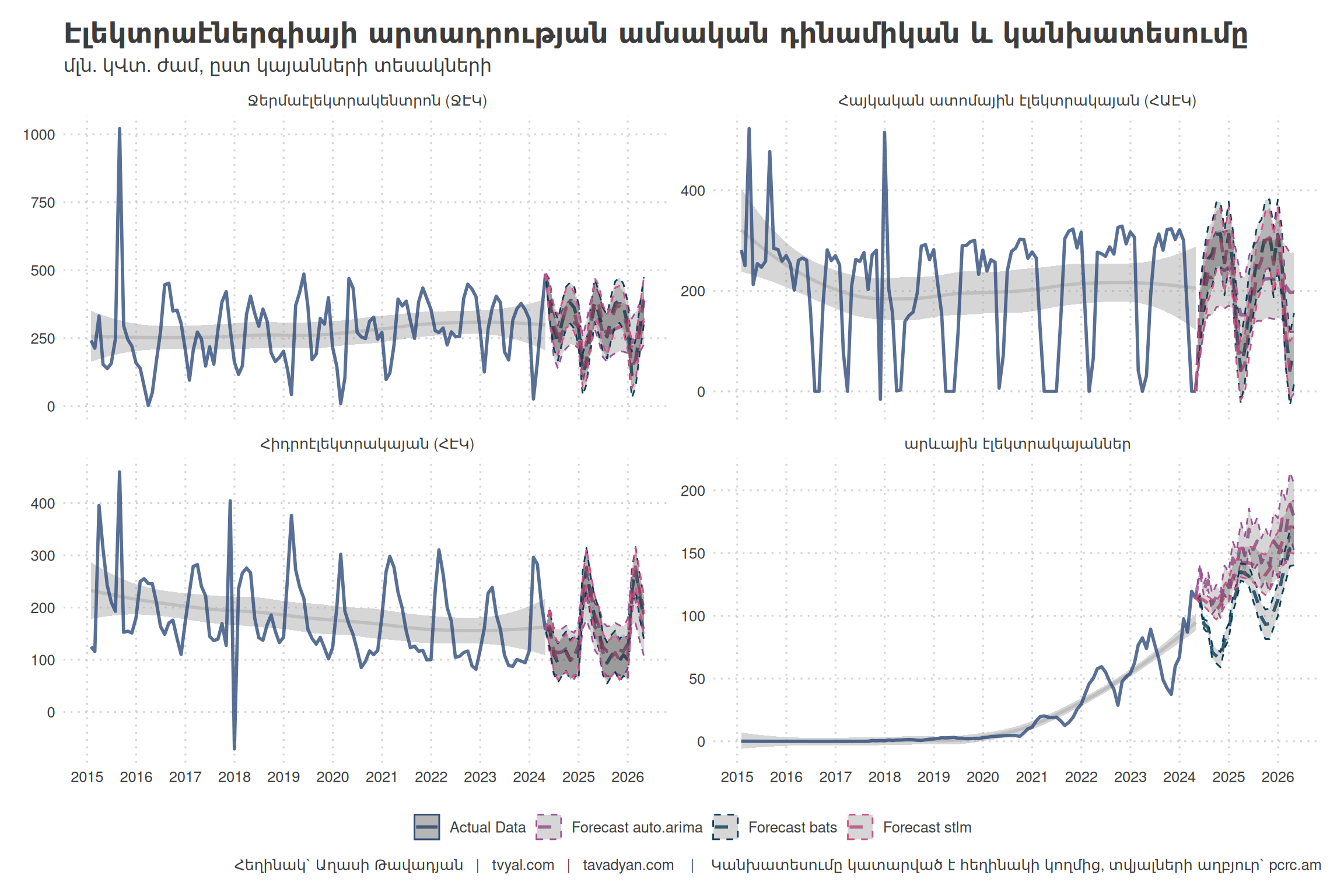 4-րդ գծապատկերում ցուցադրված է Հայաստանում արտադրված էլեկտրաէներգիայի ամսական ծավալները` ըստ էլեկտրակայանների տեսակների: Գծապատկերում տրված է նաև 2 տարվա կանխատեսումը մինչև 2026 թվականի հունիսը: