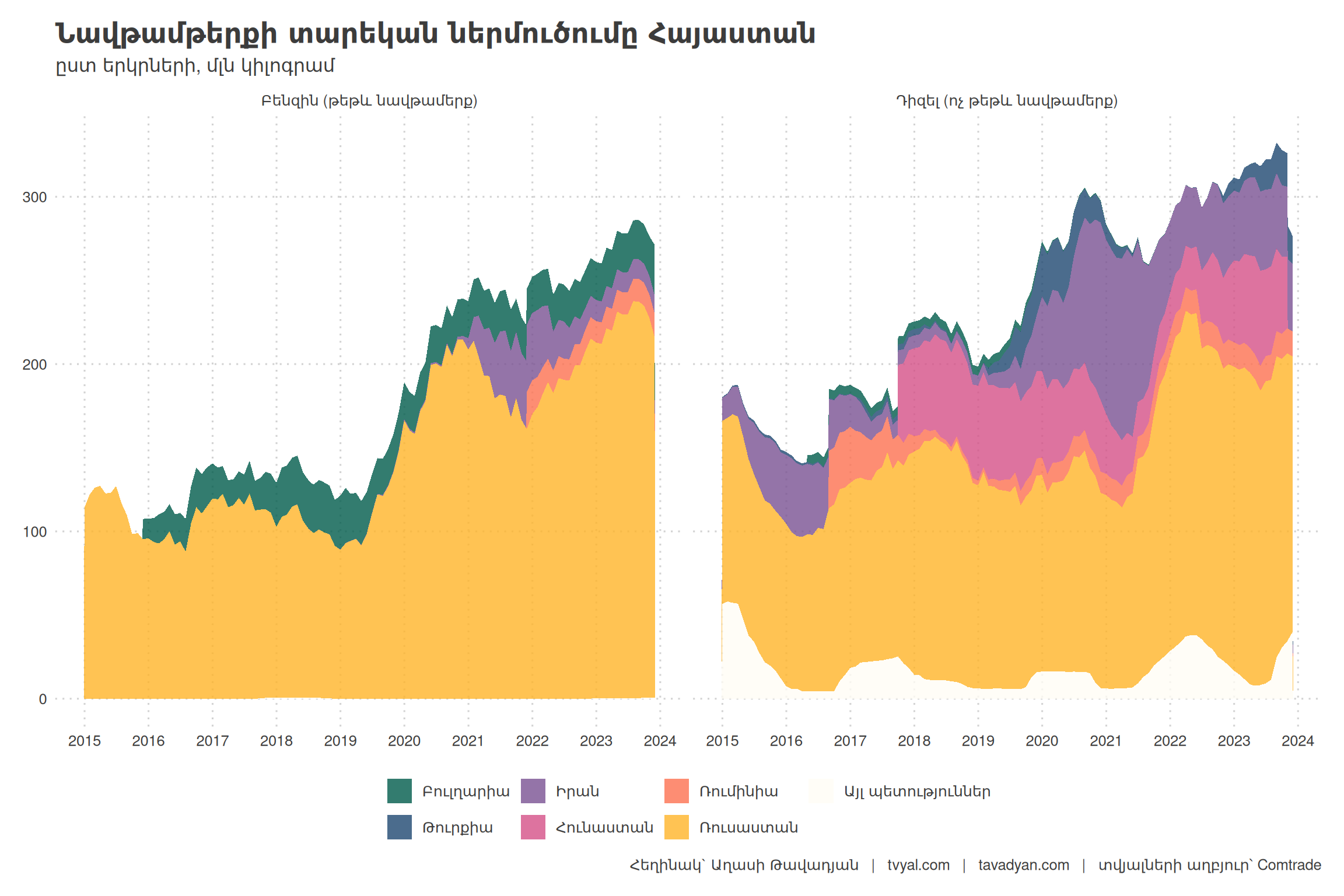 Գծապատկեր 2-ում ներկայացված է բենզինի ընդհանուր քանակության ներմուծումը միլիոն կիլոգրամով: Ինչպես երևում է գծապատկերից նավթամթերքի ներմուծման ծավալները 2010-ից 2019թ. սկիզբը եղել են գրեթե անփոփոխ: 2019 թվականից սկսած գրանցվել է նավթամթերքի ներմուծման շարունակական և կայուն աճ: 2017թ. ներմուծվել է համապատասխանաբար 200 և 140 մլն կիլոգրամ դիզվառելիք և բենզին, իսկ 2023թ արդեն 300 և 225 հազար կիլոգրամ: Ընդհանուր նավթամթերքի ներկրումը վերջին 5 տարիների ընթացքում աճել է 1.5 անգամ։ Հուշագրավ է նաև, որ 2023 թվականի ընթացքում նավթամթերքի ներմուծման քանակական աճ գրեթե չի գրանցվել և այդ տարվա կեսերից աճը բացասական միտում ունի։ Նավթամթերքը էներգիայի կարևոր աղբյուր է, որն ապահովում է տրանսպորտային և արդյունաբերական գործունեությունը: Երբ երկիրն ավելի շատ նավթամթերք է ներկրում, դա ընդհանուր առմամբ նշանակում է, որ էներգիայի ներքին պահանջարկը մեծանում է։ Սա կարող է լինել աճող տնտեսության ցուցանիշ, որը վկայում է սպառողական ծախսերի, ձեռնարկատիրական գործունեության և արդյունաբերական արտադրության աճի մասին: