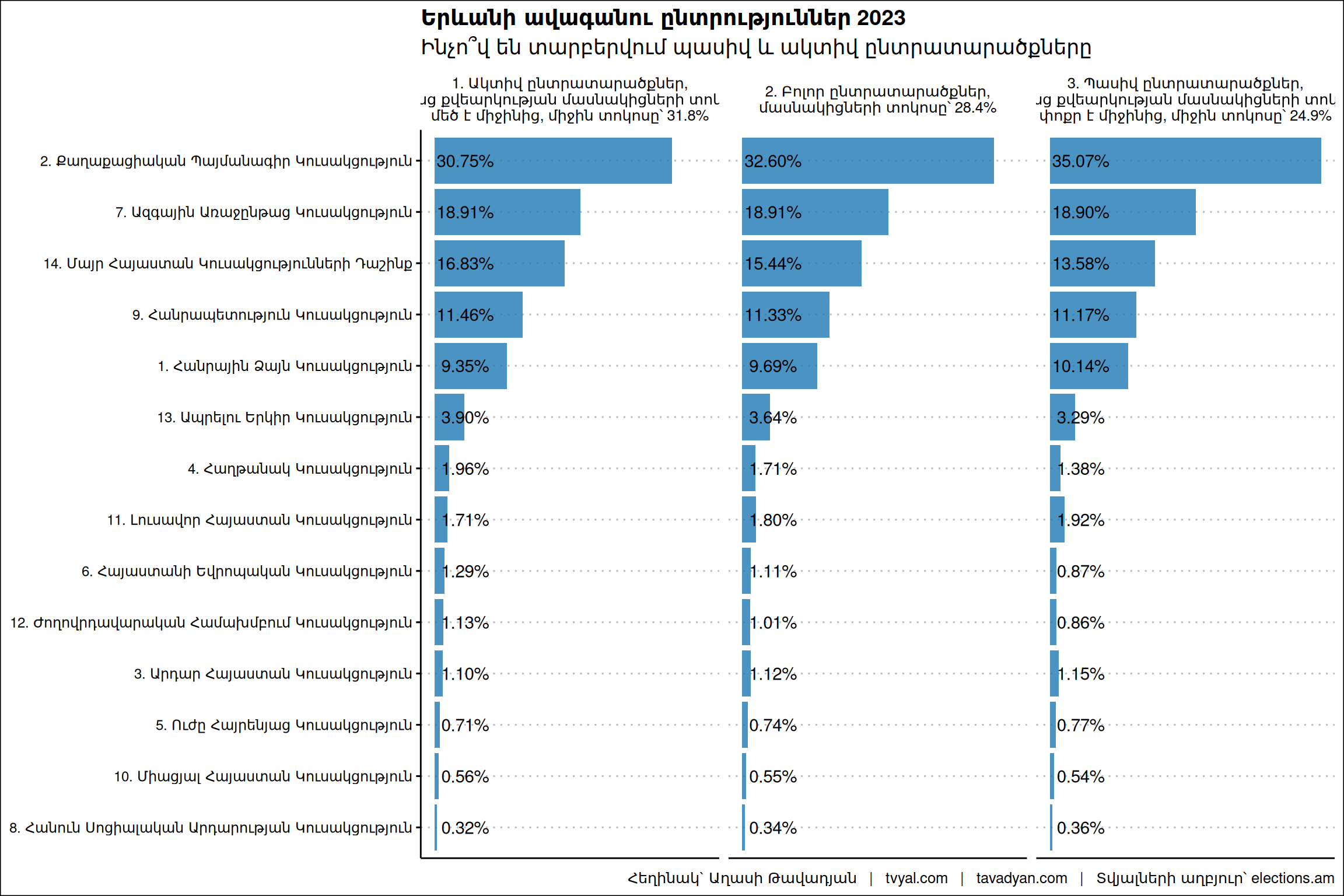 ️В активных избирательных округах партия «Гражданский договор» (ՔՊ) получила на 2 % меньше голосов, тогда как в пассивных округах, напротив, на 2,5 % больше.