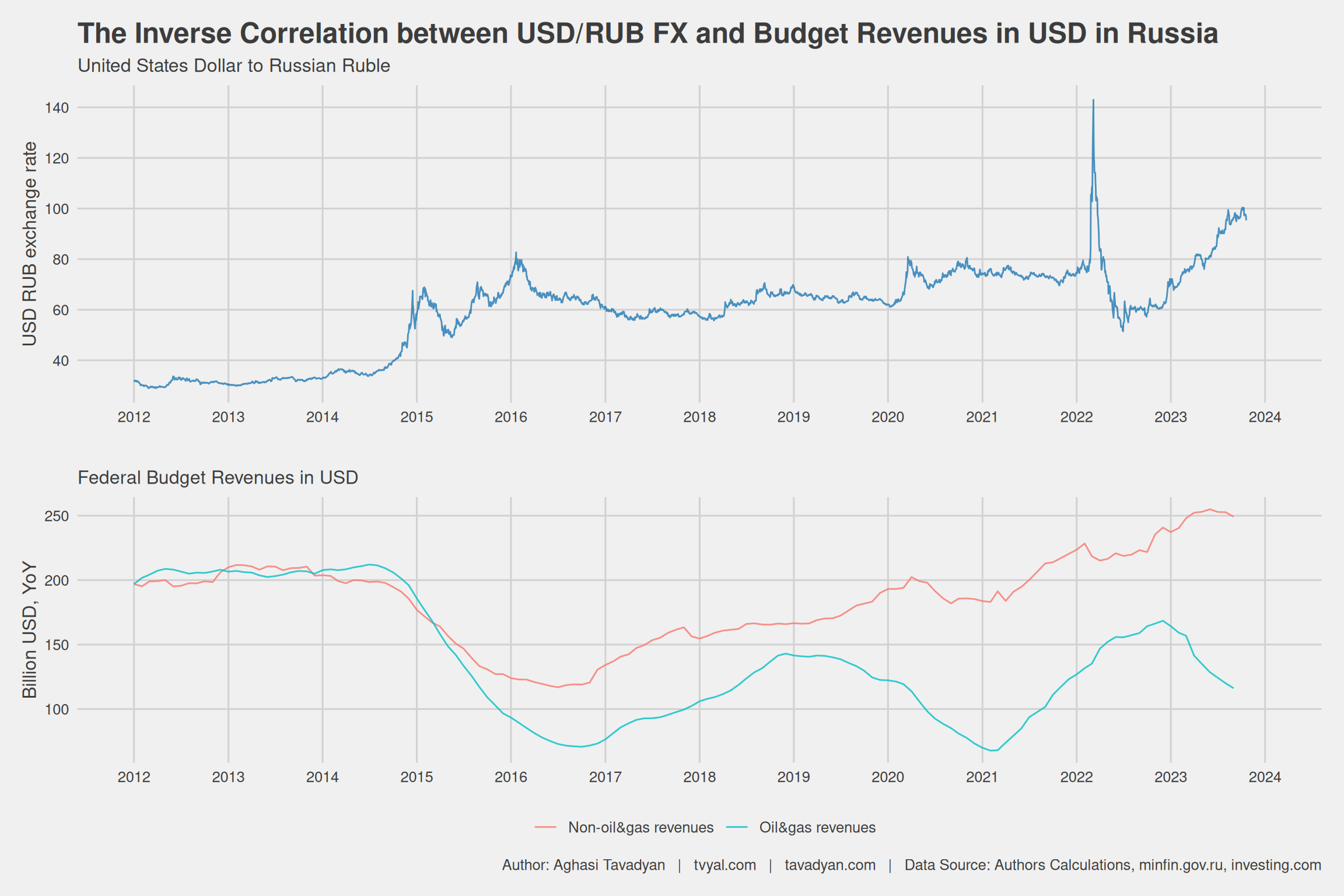 this we we analized the financial dynamics of Russia’s budget, where we delve into a series of compelling charts. In “Chart 1,” we explore the fascinating evolution of Russian budget revenues, highlighting the transition from heavy reliance on oil and gas income to the emergence of non-oil revenues. The impact of global oil prices, the COVID-19 pandemic, and sanctions on Russia is clearly illustrated. “Chart 2” takes us on a journey through the interplay between exchange rates and Russian budget income in USD, revealing the critical role the ruble’s exchange rate plays in shaping the nation’s finances.