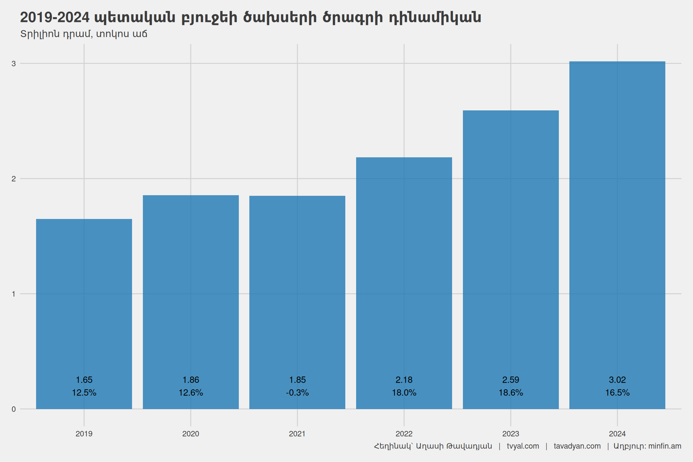 В целом бюджетный показатель увеличился в 2 раза с 2018 года. В 2018 году прогнозируемые расходы государственного бюджета составили 1,46 триллиона драмов, тогда как в 2024 году данный показатель достиг уже 3,02 триллиона драмов. Дефицит государственного бюджета Республики Армения на 2024 год составит 340 миллиардов драмов, или 3,2 процента от ВВП, вследствие чего соотношение «долг/ВВП» к концу 2024 года может достигнуть 48,4 процента.