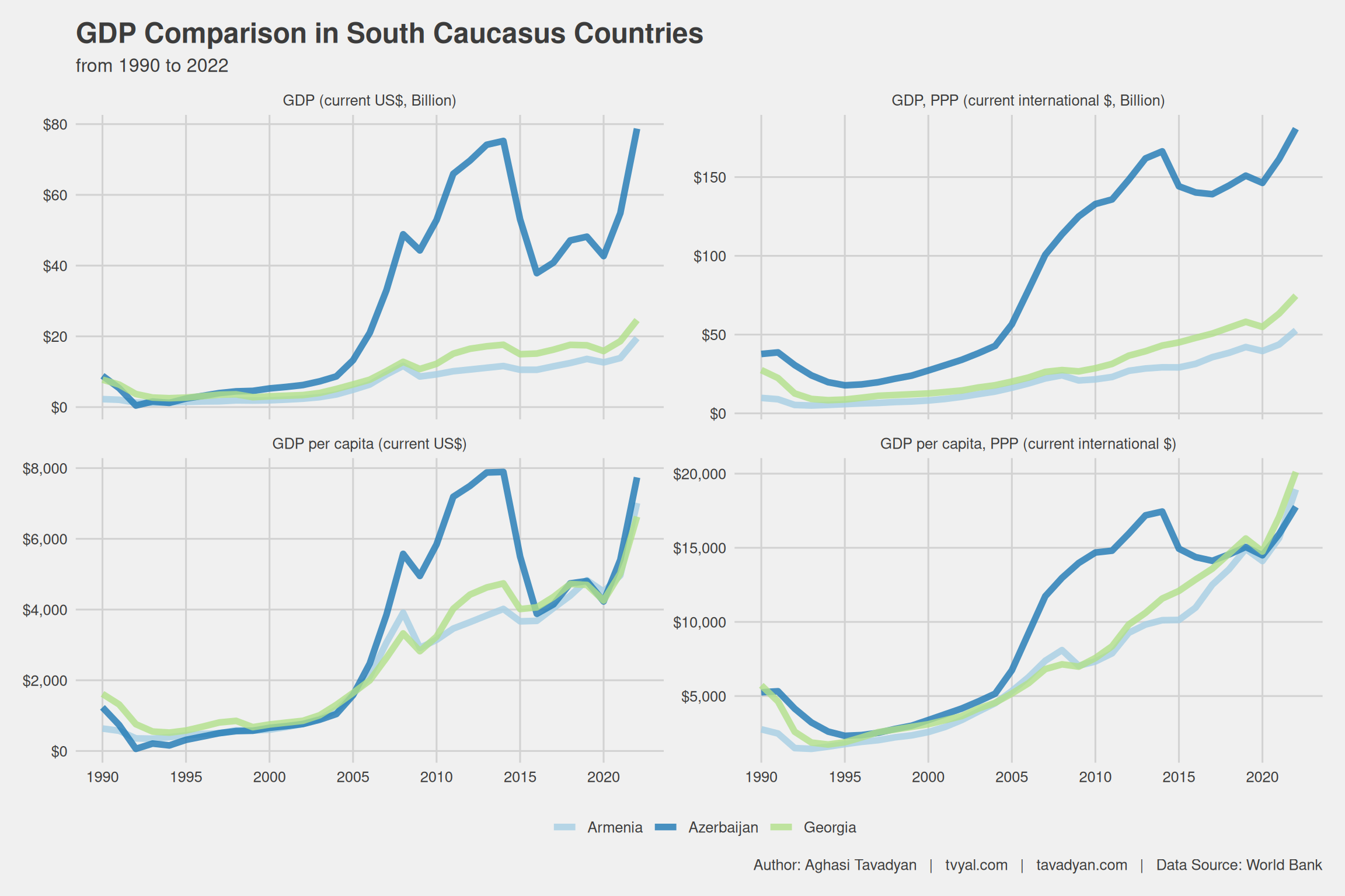 До 2004 года показатели ВВП государств Южного Кавказа были сопоставимы. ВВП на душу населения по ППС в государствах Южного Кавказа также сопоставим. Показатель ВВП на душу населения, рассчитанный по паритету покупательной способности (GDP per capita, PPP), демонстрирует уровень благосостояния среднего гражданина в данном государстве.