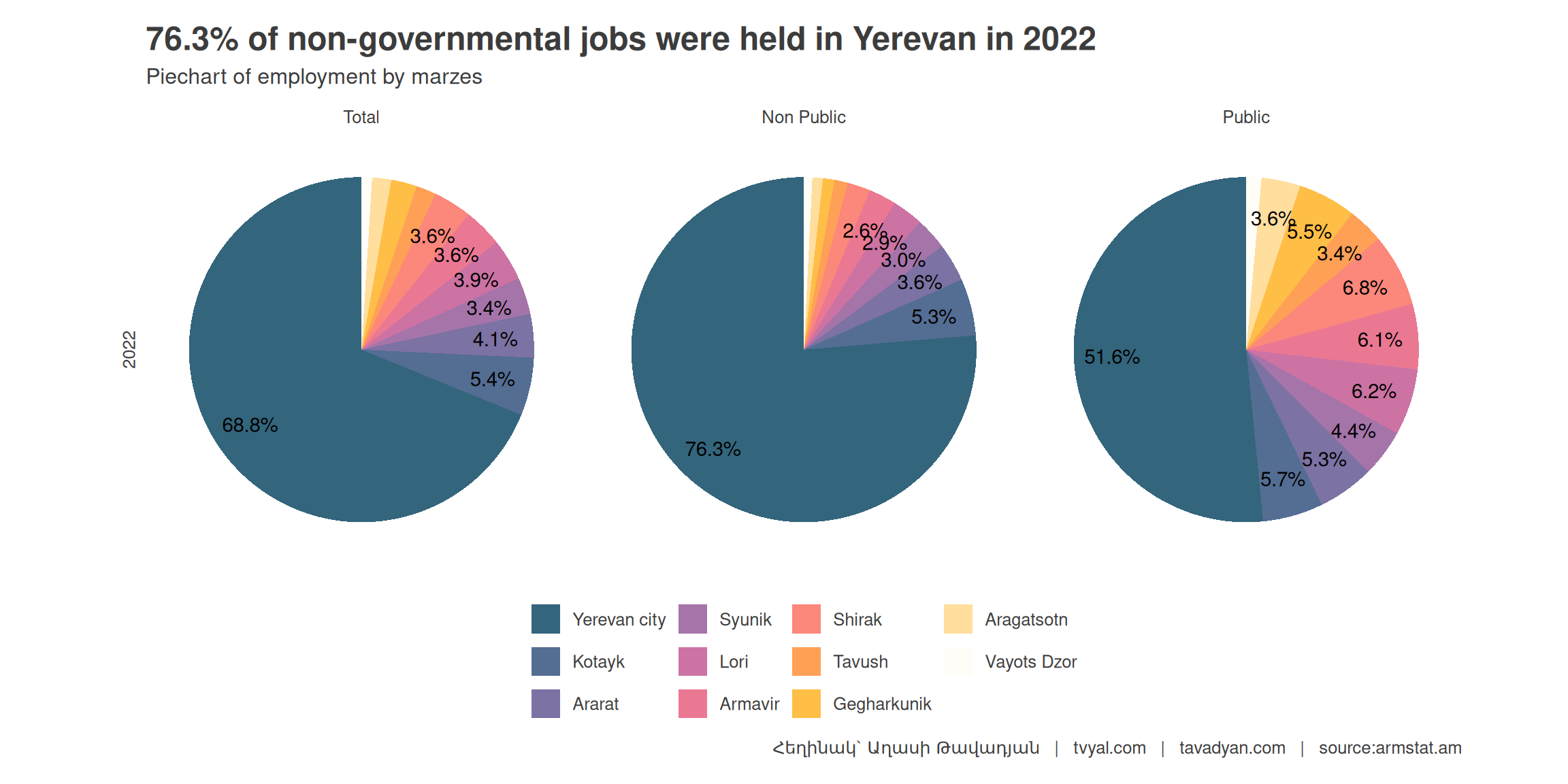 За последние три года (2022 год по сравнению с 2019 годом) число рабочих мест в регионах увеличилось всего на 4,7 процента, тогда как в Ереване — на 19,5 процента. В регионах число рабочих мест в частном секторе возросло на 7,2 процента, в то время как в Ереване рост был более существенным — 24,5 процента. Наименьший рост числа рабочих мест зафиксирован в Лорийской области — всего 2,5 процента. За этот период в Араратской области число рабочих мест в государственном секторе увеличилось на 6,4 процента, достигнув 10 975 работников, а в Ереване — с 101 744 до 107 039 работников, что составляет рост на 5,2 процента.