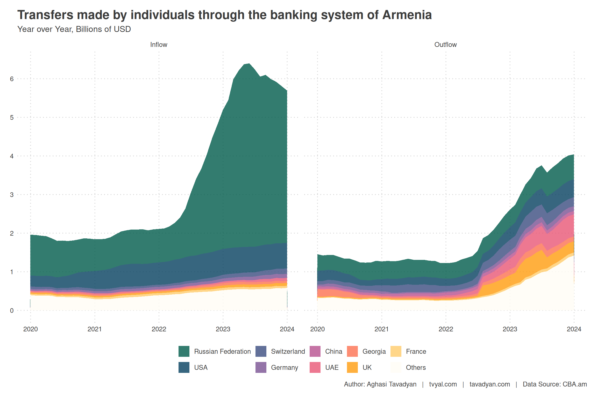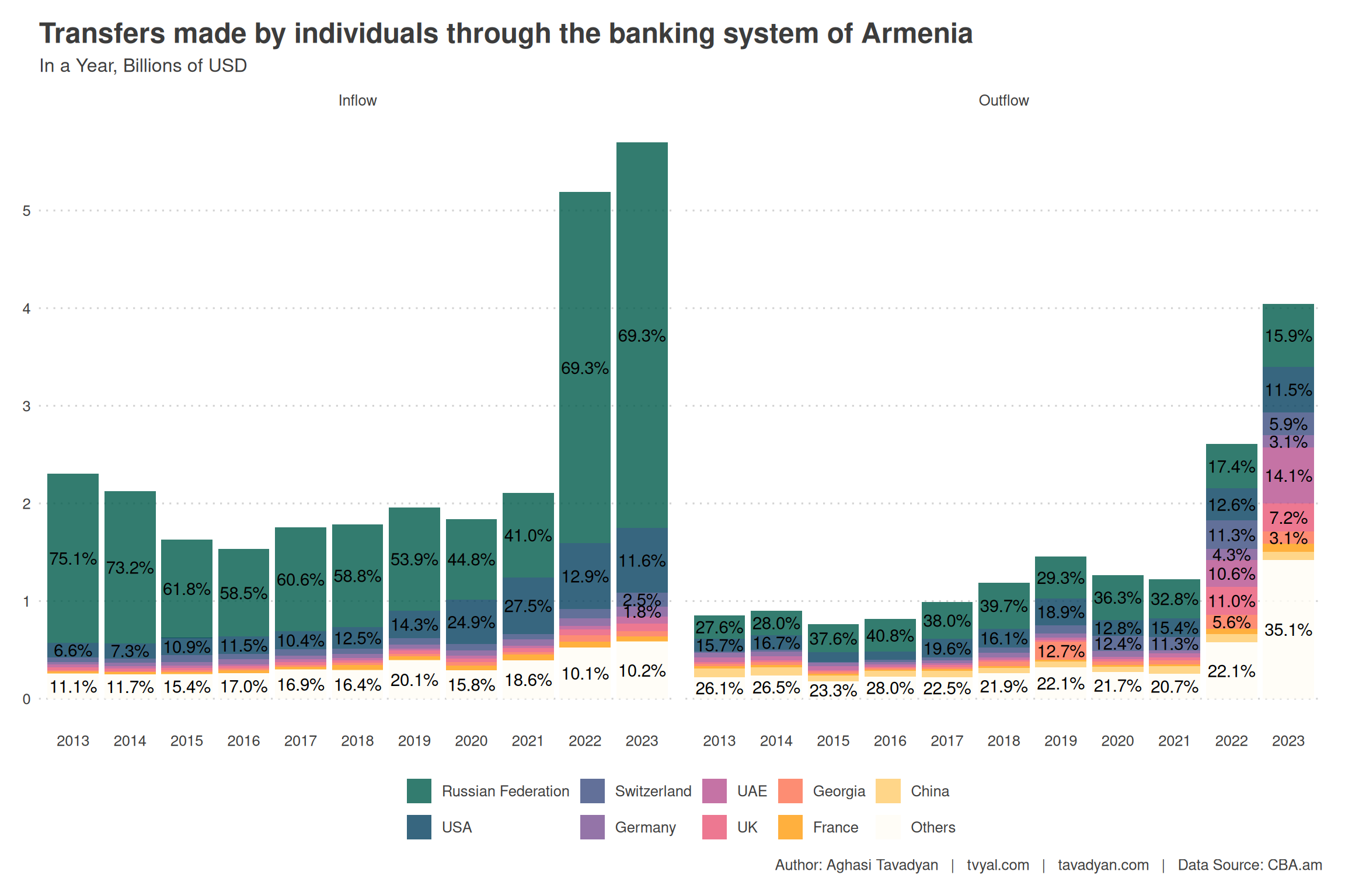 Беспрецедентный рост переводов физических лиц в армянские банки был зафиксирован в 2022 году: их объем увеличился в 2,5 раза, достигнув 5,2 млрд долларов (с 2,1 млрд долларов). Приток иностранной валюты в банковскую систему возрос в 2,5 раза в 2022 году, в то время как отток увеличился в 2,1 раза; чистый приток вырос почти в 3 раза в 2022 году — с 0,9 млрд долларов до 2,9 млрд долларов. Данный рост был обусловлен преимущественно банковскими переводами из России, объем которых возрос в четыре раза: с 865 млн долларов до 3,6 млрд долларов. Значительные средства (преимущественно в долларах) были переведены в Армению в результате этих процессов, что привело к росту предложения доллара, а также способствовало укреплению драма, зафиксированному в апреле-июне 2022 года, когда курс доллара снизился с 480 до 405 драмов.
