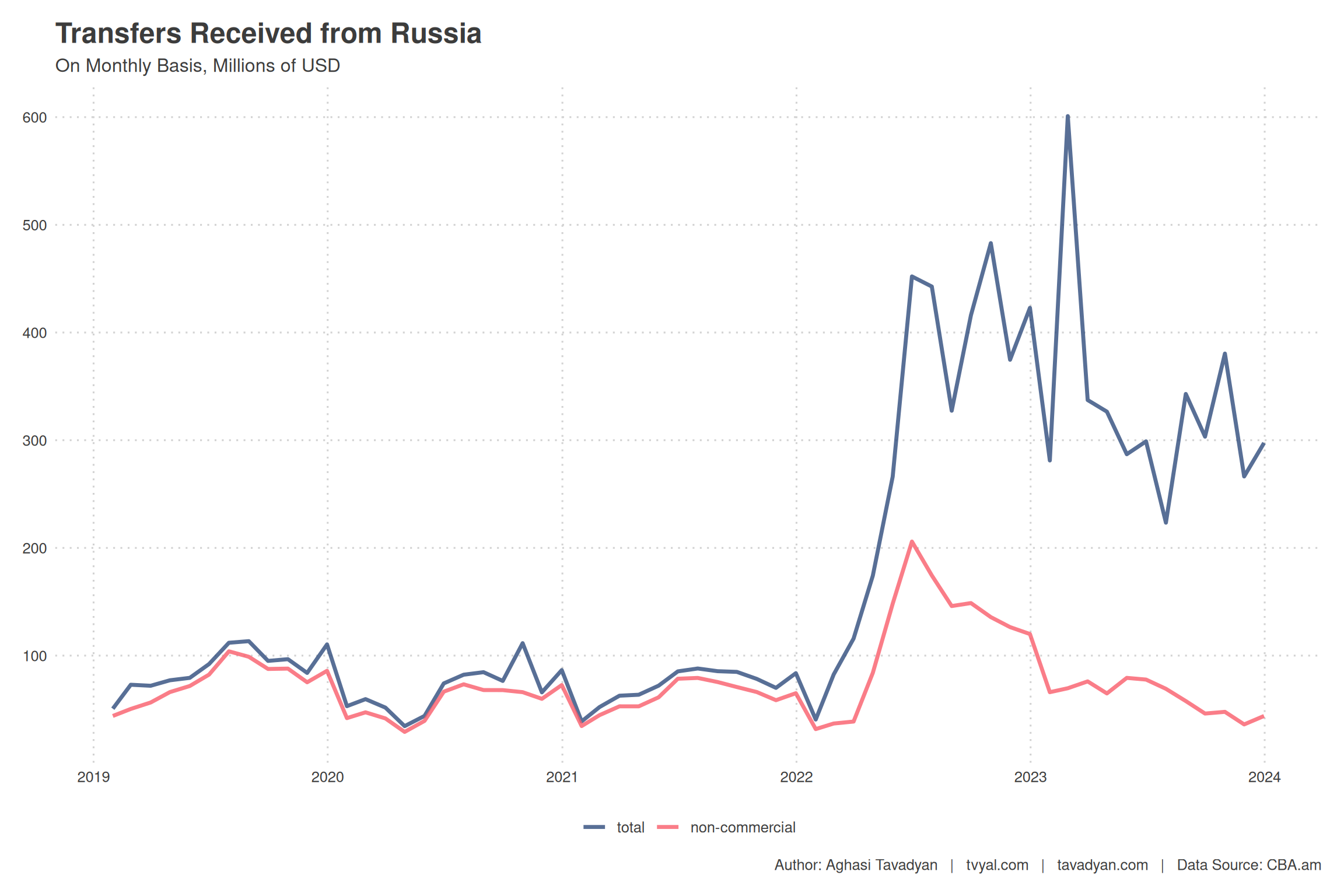 График 3. Некоммерческие и общие банковские переводы, полученные из России (в месячном разрезе, млн долларов США)