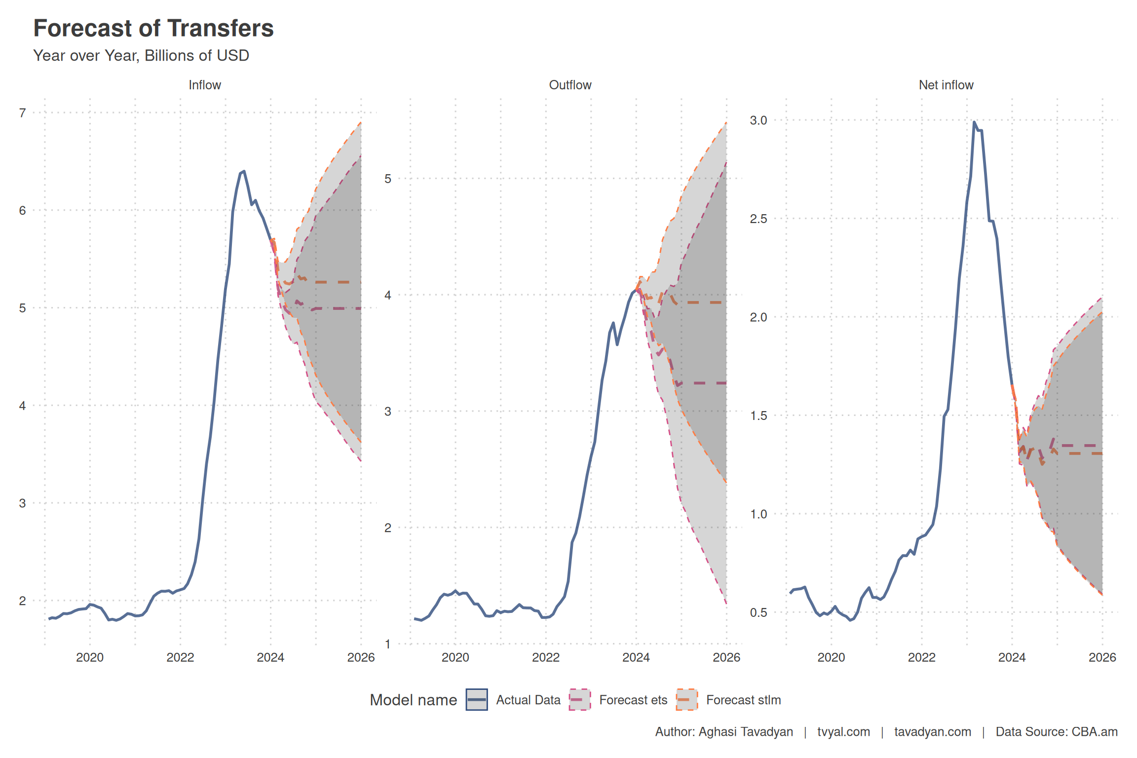 * Следует отметить наличие определенной терминологической путаницы между понятиями «трансферты» и «банковские переводы». Банковские переводы включают в себя все виды переводов, в том числе и в коммерческих целях. Трансферты представляют собой исключительно некоммерческие переводы физических лиц (в английском языке данный термин обозначается как «remittances»). Путаница возникает из-за того, что английский термин «transfers» применяется ко всем видам коммерческих и некоммерческих переводов. Все виды коммерческих и некоммерческих денежных переводов обозначаются английским термином «transfers» на графиках. Все данные для данного анализа получены из официальных источников, в частности, из данных Центрального банка. Расчеты и код прогнозирования полностью доступны на github, их можно проверить, посетив нашу страницу на github, где представлены данные, код для расчетов и графики.