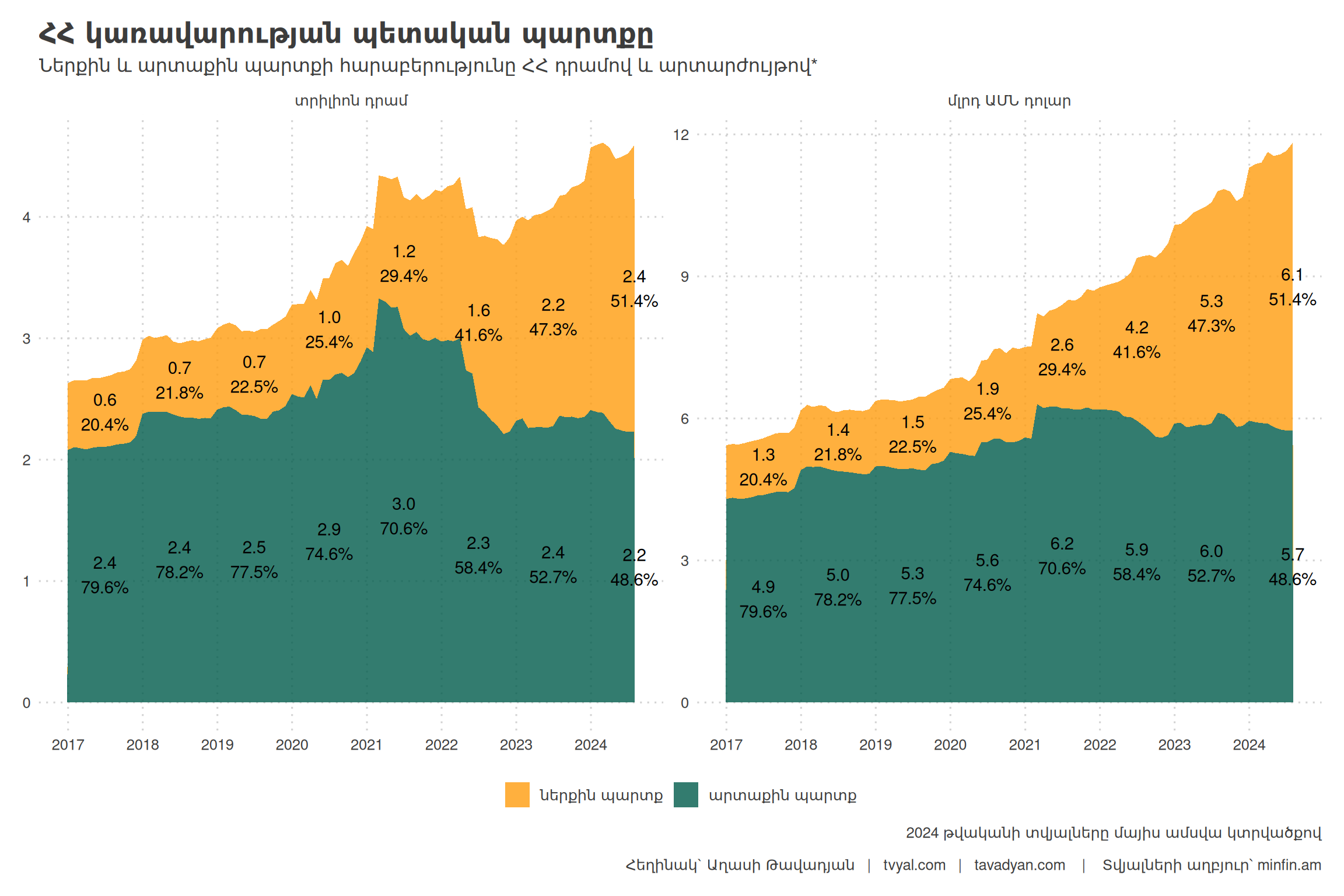 В структуре государственного долга Республики Армения доля внутреннего долга впервые превысила 50 процентов. По состоянию на май 2024 года государственный долг правительства составил 11 млрд 577 млн долларов США или 4 триллиона 496 млрд драмов. На внутренние источники приходится 50,2 процента данной суммы, а на внешние — 49,8 процента.