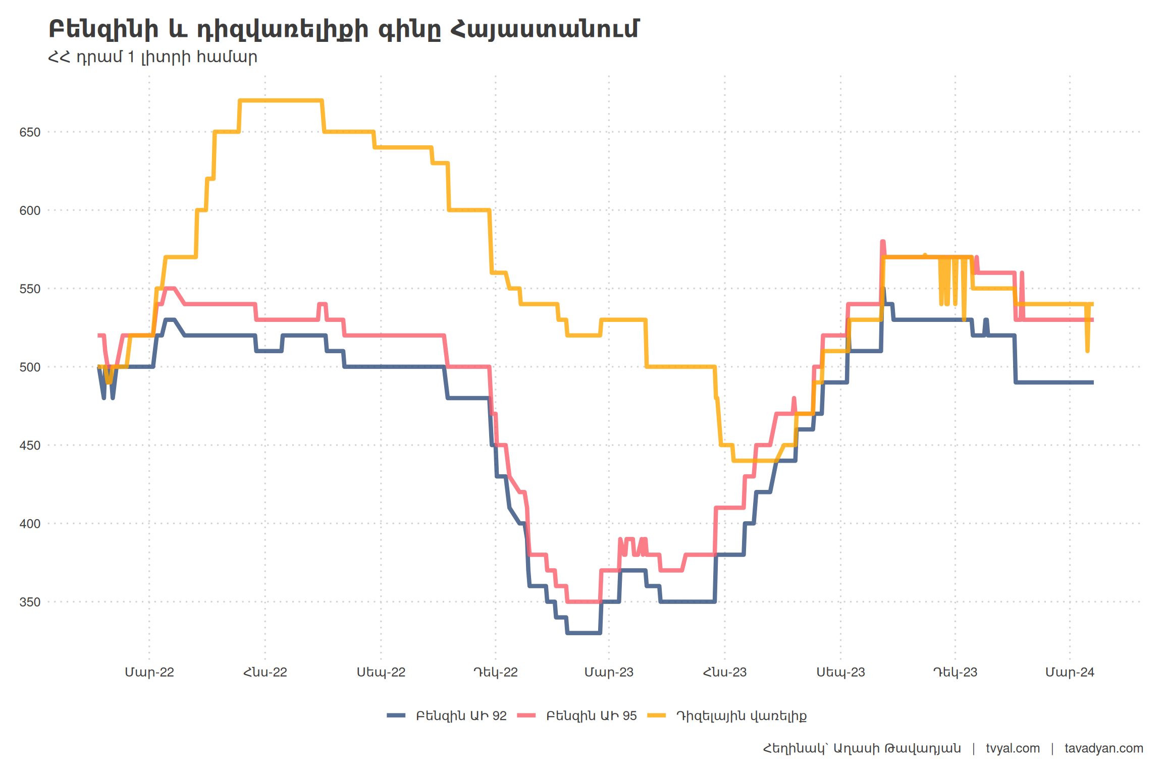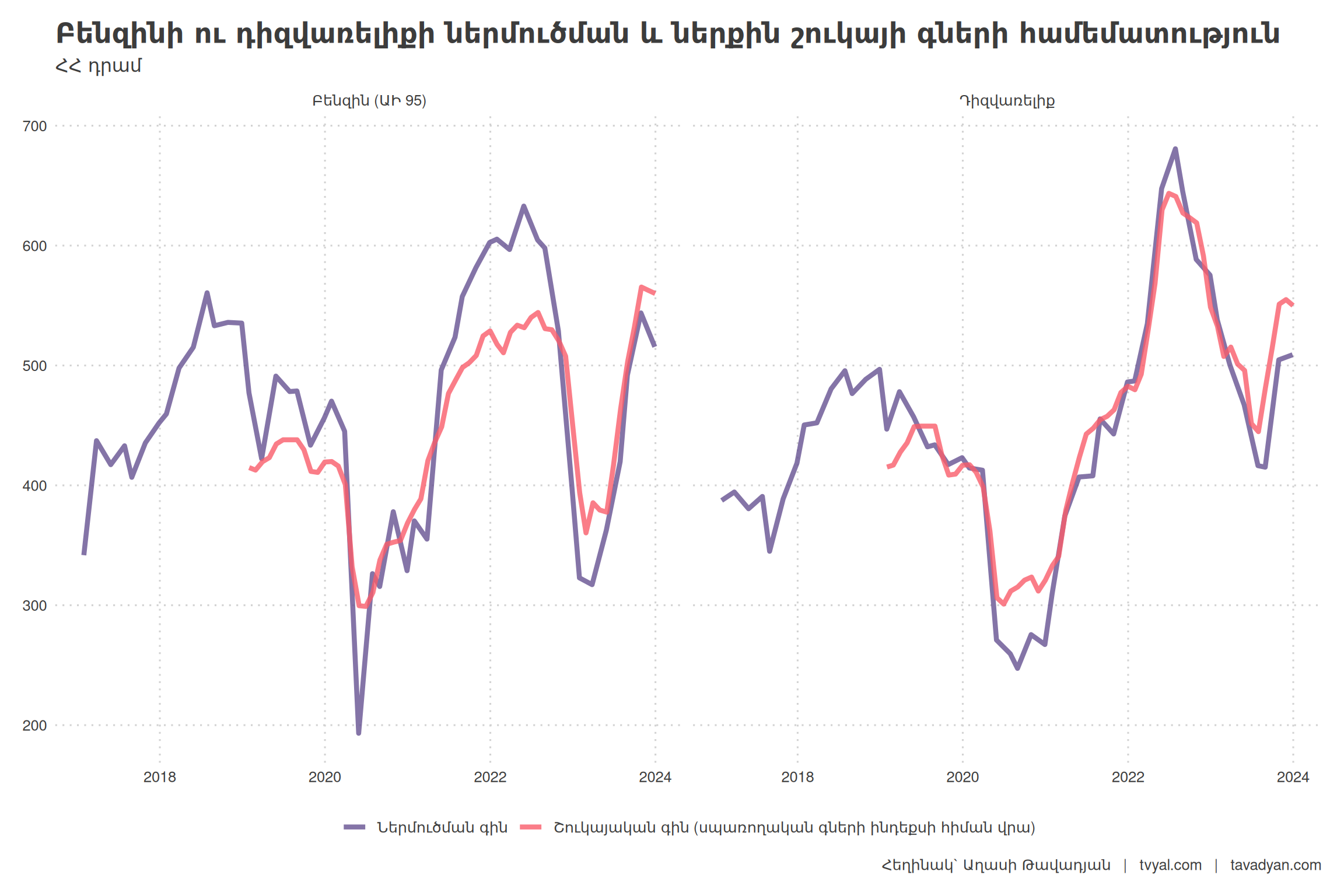 Ниже представлена импортная цена на бензин и дизельное топливо. Значение было получено путем деления стоимостных показателей импорта за конкретный месяц на натуральные (количественные) показатели, что позволило определить импортную стоимость одного килограмма бензина в долларах США. Полученный показатель был разделен на плотность бензина и дизельного топлива, после чего умножен на средний обменный курс доллара США к армянскому драму за соответствующий месяц. Следует признать, что рассчитанный показатель имеет определенные погрешности, так как плотность нефтепродуктов варьируется в зависимости от температуры, кроме того, для расчетов целесообразнее использовать цену продажи доллара на внутреннем рынке, а не средний курс. Несмотря на это, динамика данного показателя позволяет сформировать четкое представление о колебаниях стоимости нефтепродуктов на границе при их приобретении хозяйствующими субъектами. Именно закупочная цена бензина и дизельного топлива на границе является ключевым фактором, определяющим конечную стоимость бензина на внутреннем рынке.