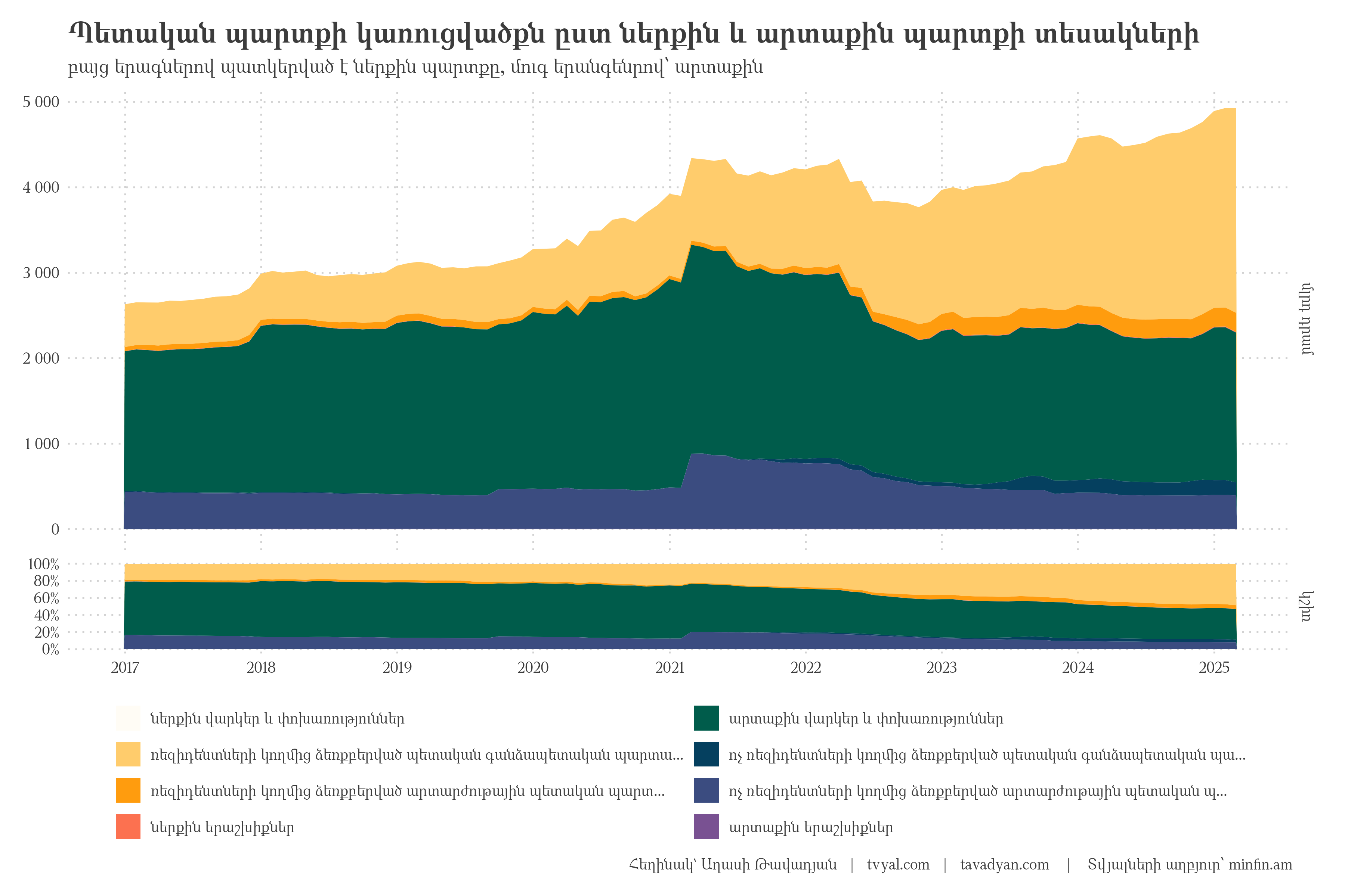 Присутствуют также положительные новости для экономики. В структуре государственного долга Армении доля внутреннего долга впервые превысила 50%. В абсолютном выражении, из общего долга в 12,5 млрд долларов (или 4,9 трлн драмов) доля внутреннего долга уже составляет 50,2%, а на внешние источники приходится оставшиеся 49,8%.