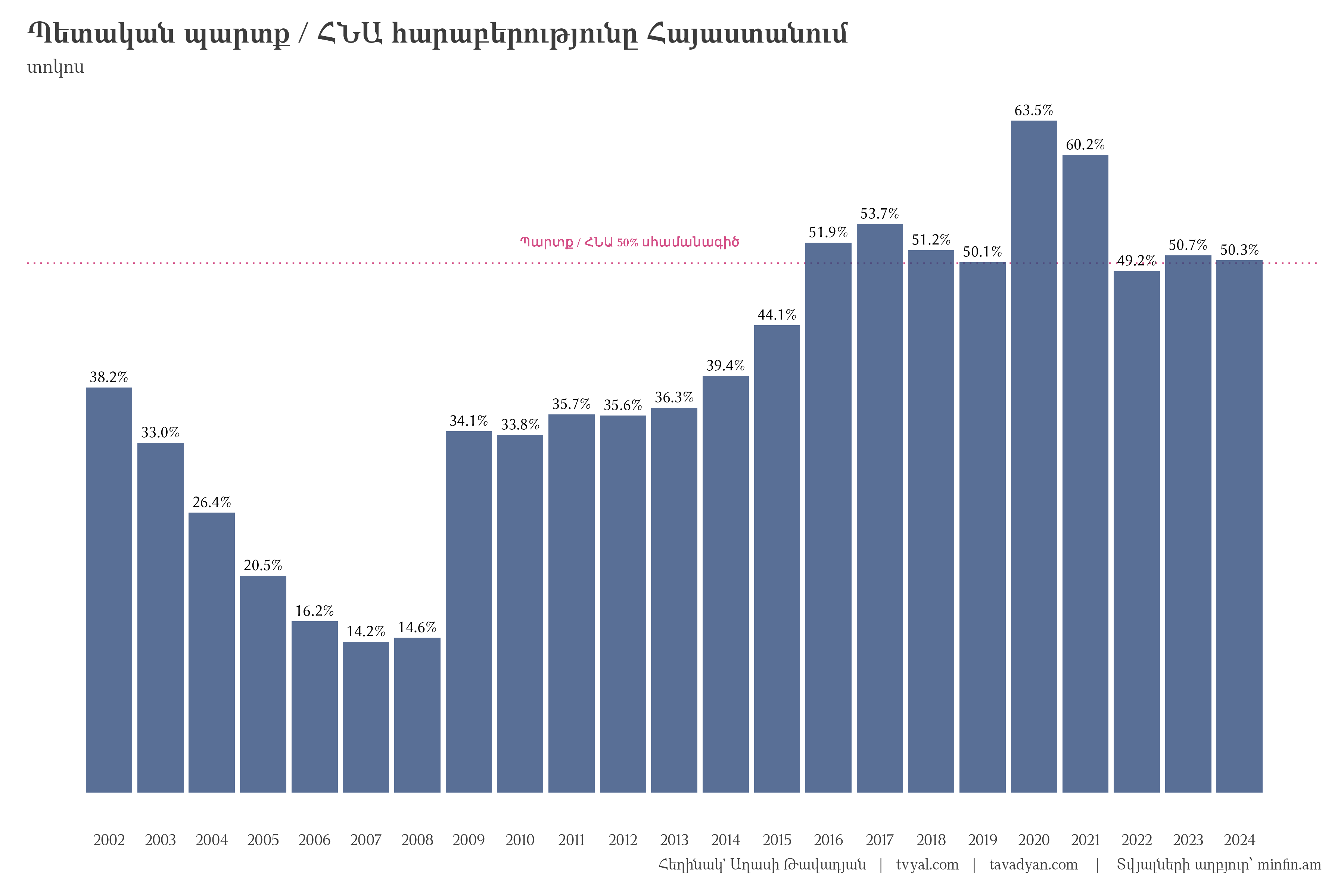 Соотношение государственного долга и ВВП выступает в качестве одного из важнейших показателей для любой страны. В настоящее время в Армении этот показатель составляет около 50%. Данный уровень представляет собой опасную зону. Согласно соглашению о ЕАЭС, государство взяло на себя обязательство не допускать превышения показателем отметки в 50%.